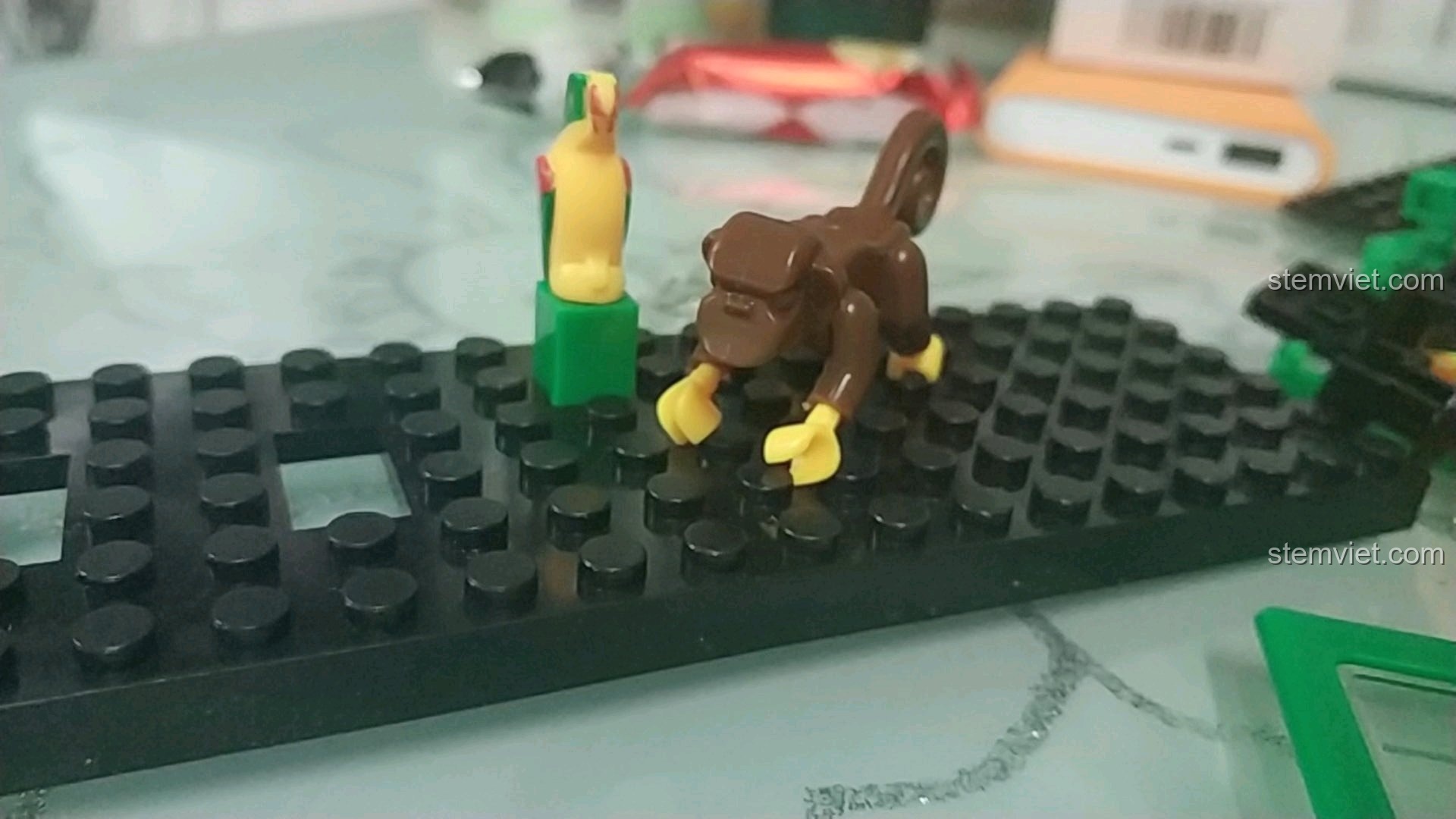 Bên cạnh 2 minifigure ông già Noel, bộ sản phẩm còn có 2 figure động vật là khỉ và vẹt, cùng các phụ kiện trang trí nội thất như bàn, ghế, hộp quà, cây thông Noel mini, tạo nên một không gian vui chơi sinh động.