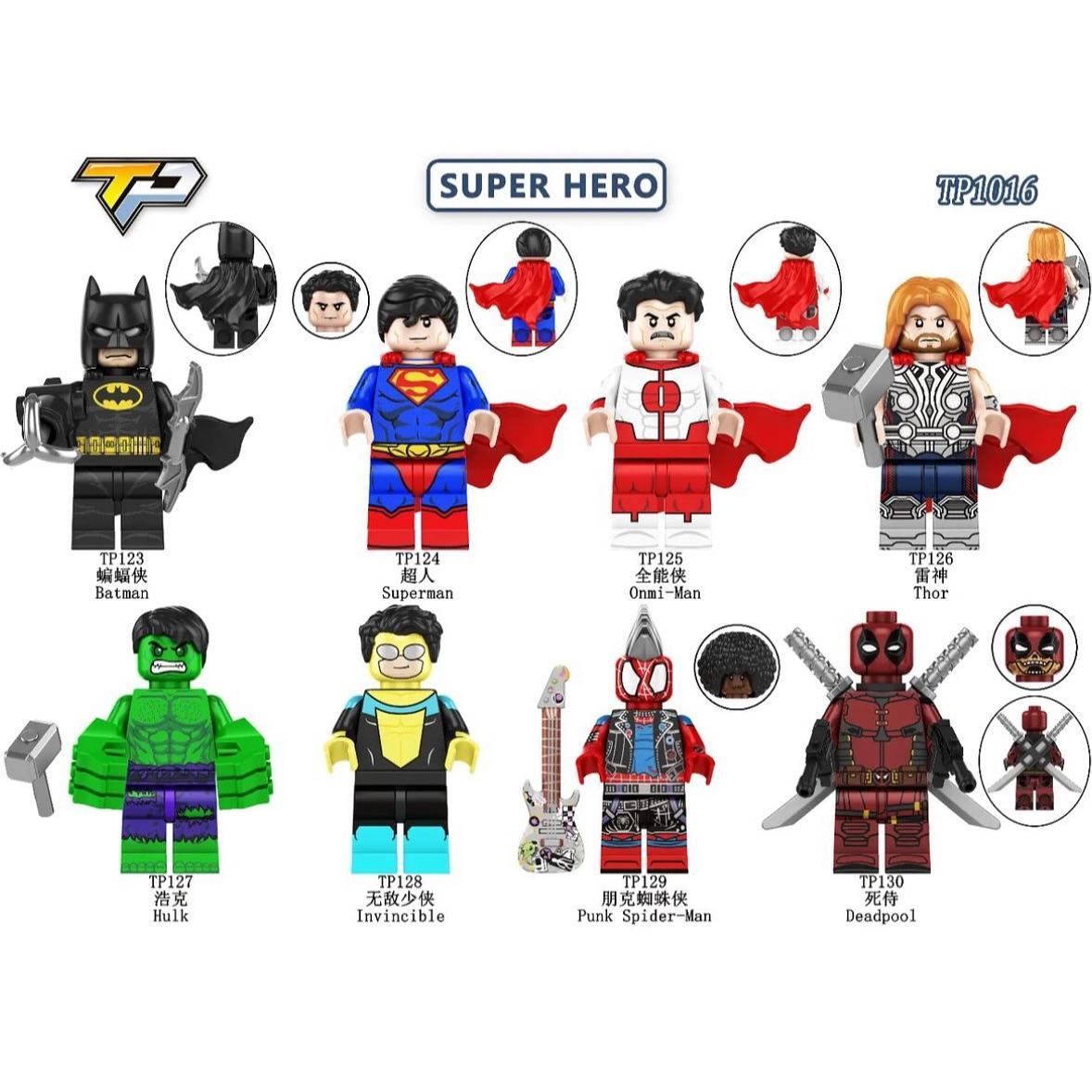 Bộ đồ chơi Siêu nhân TP128 bao gồm 8 nhân vật siêu anh hùng: Batman, Superman, Omni-Man, Thor, Hulk, Invincible, Punk Spider-Man và Deadpool.