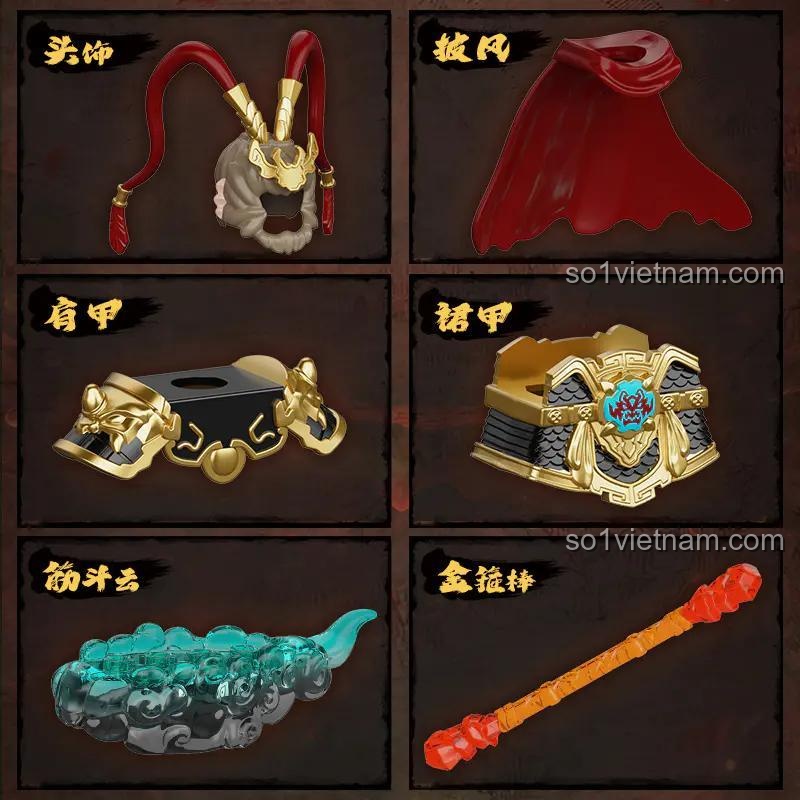 Sản phẩm figure 30321 này bao gồm 15 chi tiết, đủ để bé trai 8 tuổi lắp ráp hoàn chỉnh nhân vật Lục Nhĩ Di Hầu cùng các phụ kiện đi kèm như Kim Cô Bổng và Cân Đẩu Vân.