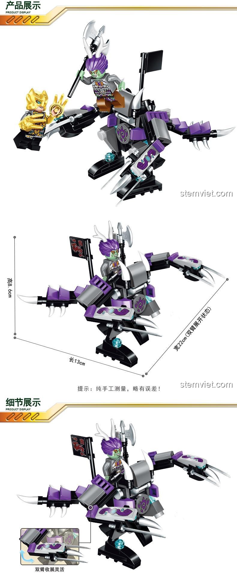 Mô hình có chiều cao 8cm, chiều dài 13cm và đặc biệt là chiều rộng lên đến 22cm khi đôi cánh tay được mở rộng linh hoạt, tạo nên một dáng vẻ hùng vĩ và uy lực. Từng đường nét, từ bộ giáp sắc nhọn, đôi sừng oai vệ cho đến những móng vuốt sắc bén, đều được tái hiện chân thực, mang đến cảm giác như một con rồng thực thụ đang hiện diện. Hai minifigure đi kèm, một chiến binh rồng màu tím và một chiến binh vàng, được thiết kế với độ chi tiết cao, trang bị vũ khí và giáp trụ, sẵn sàng cùng Ác Long Chiến Giáp QMAN 2204 tham gia vào mọi cuộc phiêu lưu.