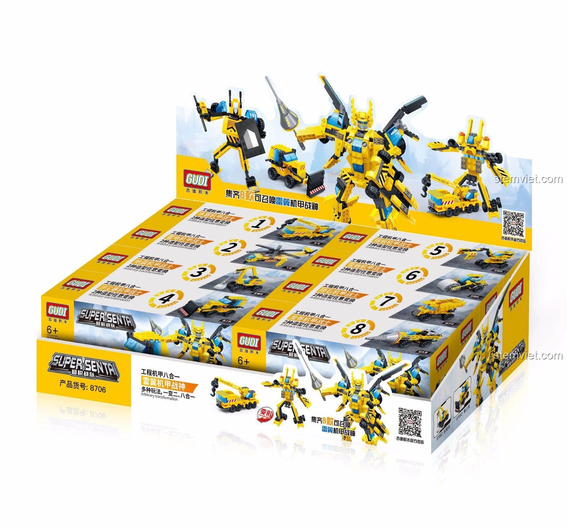 Điểm nhấn làm nên sự khác biệt của đồ chơi xây dựng Siêu robot 8706 chính là tính năng biến hình và hợp thể độc đáo. Bé có thể lắp ráp 8 chiếc xe công trình riêng biệt, mỗi chiếc đều có bánh xe và các chi tiết chuyển động linh hoạt. Sau đó, với sự hướng dẫn chi tiết, bé sẽ khám phá cách kết hợp 8 mô hình này lại để tạo thành một Robot chiến đấu GUDI 8706 khổng lồ đầy uy lực. Điều này không chỉ tăng cường khả năng tư duy không gian mà còn mang lại niềm vui khám phá bất tận.