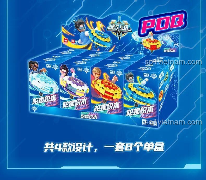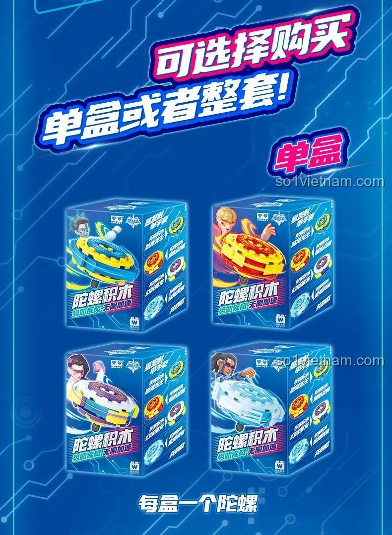 WISE BLOCK HA389213 nổi bật với thiết kế tinh xảo và màu sắc rực rỡ, thu hút mọi ánh nhìn. Bộ đồ chơi bao gồm 4 mẫu con quay khác nhau, mỗi mẫu mang một phong cách riêng biệt: