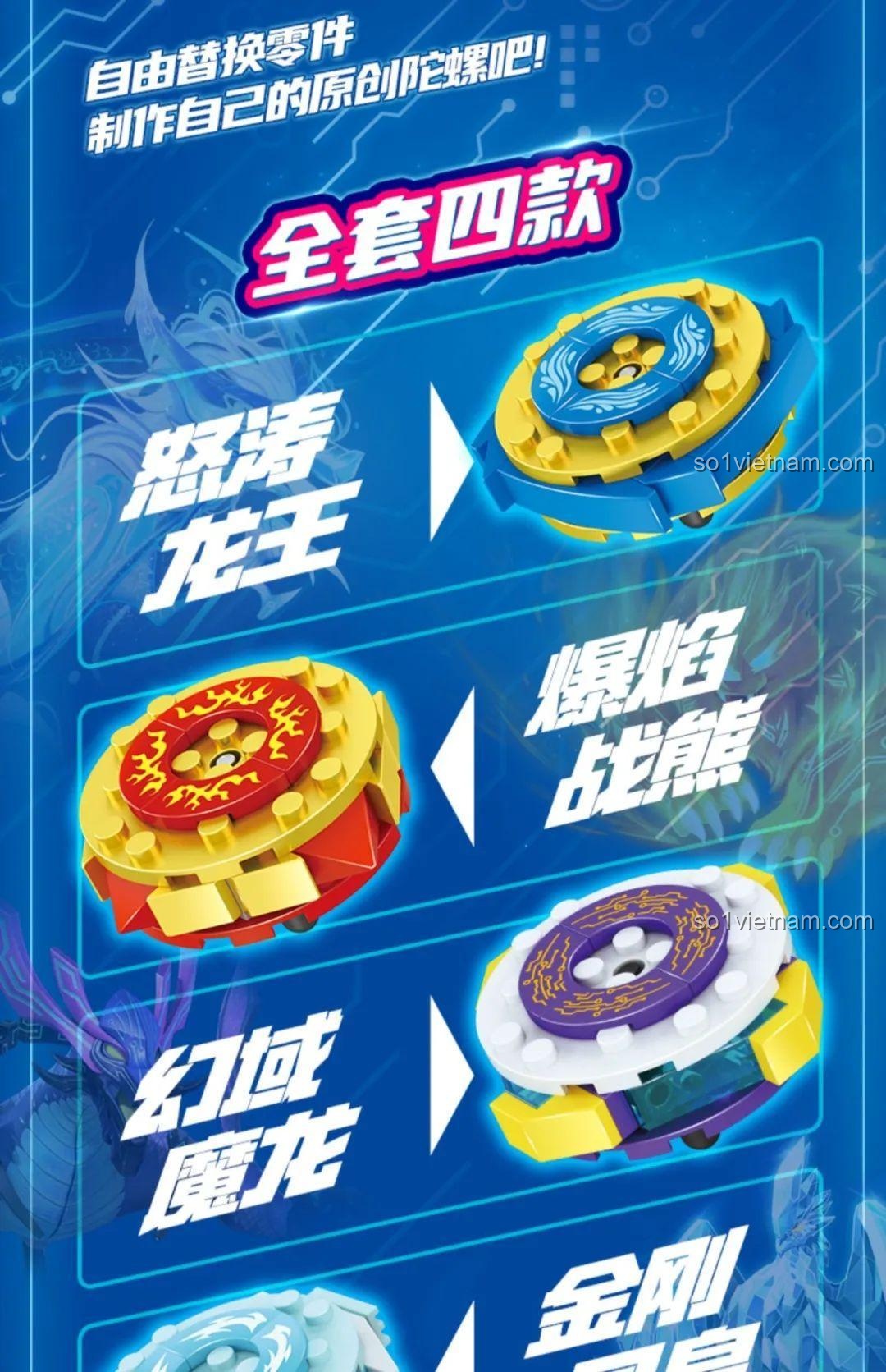 - Lắp Ráp Đa Dạng: Bộ sản phẩm cho phép bé lắp ráp thành 4 mẫu con quay khác nhau, mỗi mẫu có đặc điểm và chiến thuật riêng.