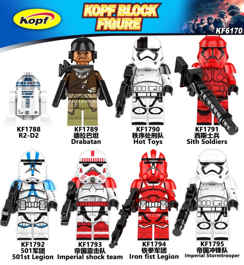 Bộ sản phẩm bao gồm 8 nhân vật Star Wars khác nhau, bao gồm R2-D2, Drabatan, Sith Soldiers, 501st Legion, Imperial shock team, Iron fist Legion và Imperial Stormtrooper.