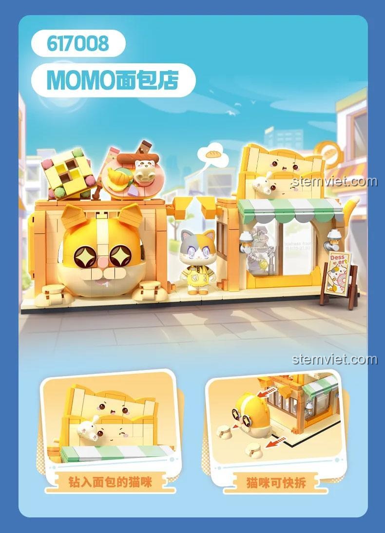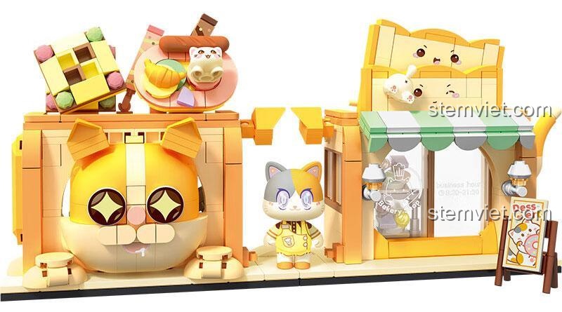 Điểm nhấn đặc biệt của bộ đồ chơi lắp ráp SEMBO 617008 chính là nhân vật mèo MOMO siêu dễ thương, có thể tháo rời và đặt vào bên trong tiệm bánh hoặc chơi riêng. Mái hiên sọc xanh lá trắng tạo cảm giác tươi mới, cùng với bảng menu tráng miệng nhỏ xinh, tất cả đều góp phần tạo nên một tiệm bánh sống động như thật. Bé sẽ vô cùng thích thú khi tự tay xây dựng nên cửa hàng bánh ngọt MOMO mơ ước của mình, từ những bức tường, cửa sổ cho đến các chi tiết trang trí nhỏ nhất.