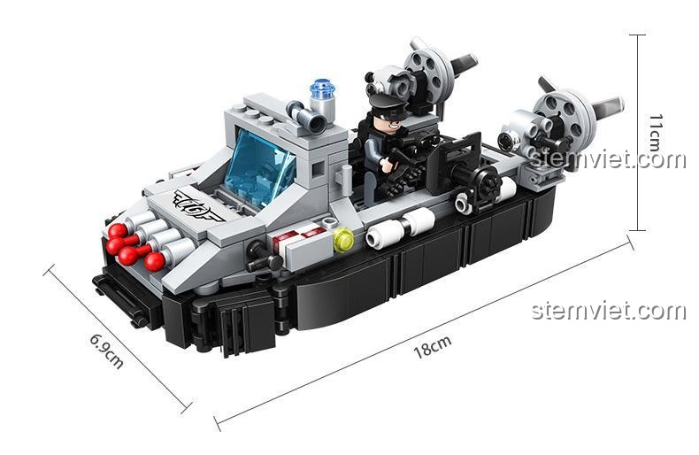 Bộ khối lắp ghép Thuyền đặc nhiệm Panlos Brick 635015 không chỉ đẹp mắt mà còn sở hữu nhiều tính năng hấp dẫn, mang lại trải nghiệm chơi đầy kịch tính. Điểm nhấn nổi bật nhất chính là khả năng bắn đạn nhựa, với các tên lửa đỏ được trang bị ở phía trước, bé có thể mô phỏng những cuộc tấn công chớp nhoáng, hạ gục mục tiêu từ xa. Mô hình còn đi kèm với 3 minifigure lính đặc nhiệm được trang bị đầy đủ vũ khí như súng phóng lựu, súng trường, súng máy và ống nhòm, sẵn sàng cho mọi nhiệm vụ. Thiết kế khí đệm độc đáo cho phép mô hình di chuyển mượt mà trên các bề mặt phẳng, tạo cảm giác như một chiếc hovercraft thực thụ đang lướt trên mặt nước. Các chi tiết như cánh quạt xoay, buồng lái mở được, và các khẩu pháo nhỏ có thể điều chỉnh góc bắn càng tăng thêm tính tương tác và chân thực cho set đồ chơi Tàu đặc nhiệm Panlos Brick 635015. Bé sẽ thỏa sức sáng tạo các kịch bản chiến đấu, từ những cuộc truy đuổi tốc độ cao đến các trận đánh lớn trên biển.