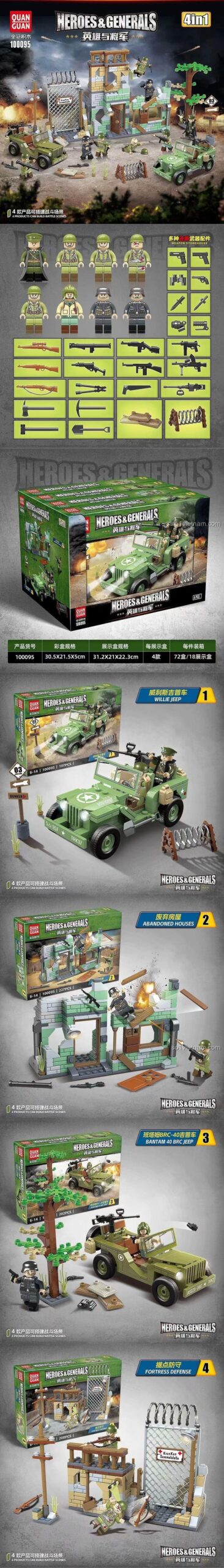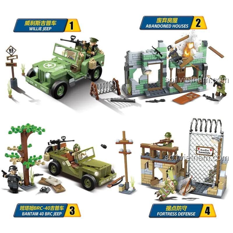 Điểm đặc biệt của bộ đồ chơi lắp ráp 100095 này là khả năng lắp ráp 4 kiểu mô hình khác nhau từ cùng một bộ chi tiết. Bé có thể tạo ra Xe Jeep Willys, Nhà Hoang Bị Bỏ Hoang, Xe Jeep Bantam BRC-40 và Pháo Đài Phòng Thủ, mang lại sự đa dạng và hứng thú không giới hạn.