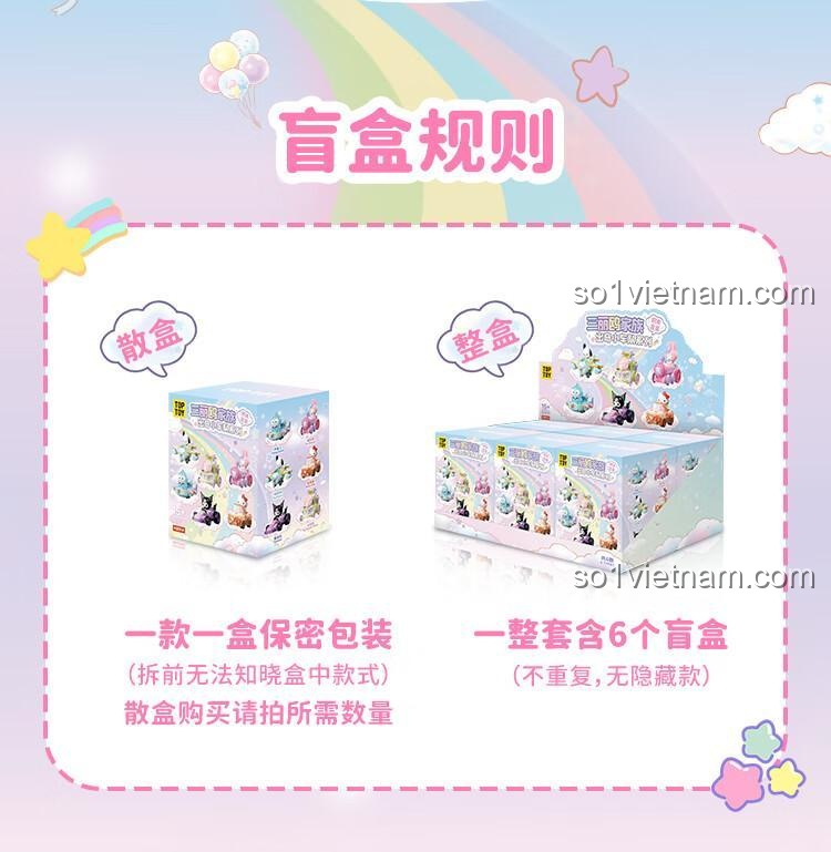 Vì đây là bộ sưu tập blind box, các mẫu xe trong TC1724 Mô hình Sanrio Characters được bán ngẫu nhiên trong từng hộp. Để sưu tập đủ 6 mẫu, bạn có thể mua cả bộ hoặc trao đổi với bạn bè.