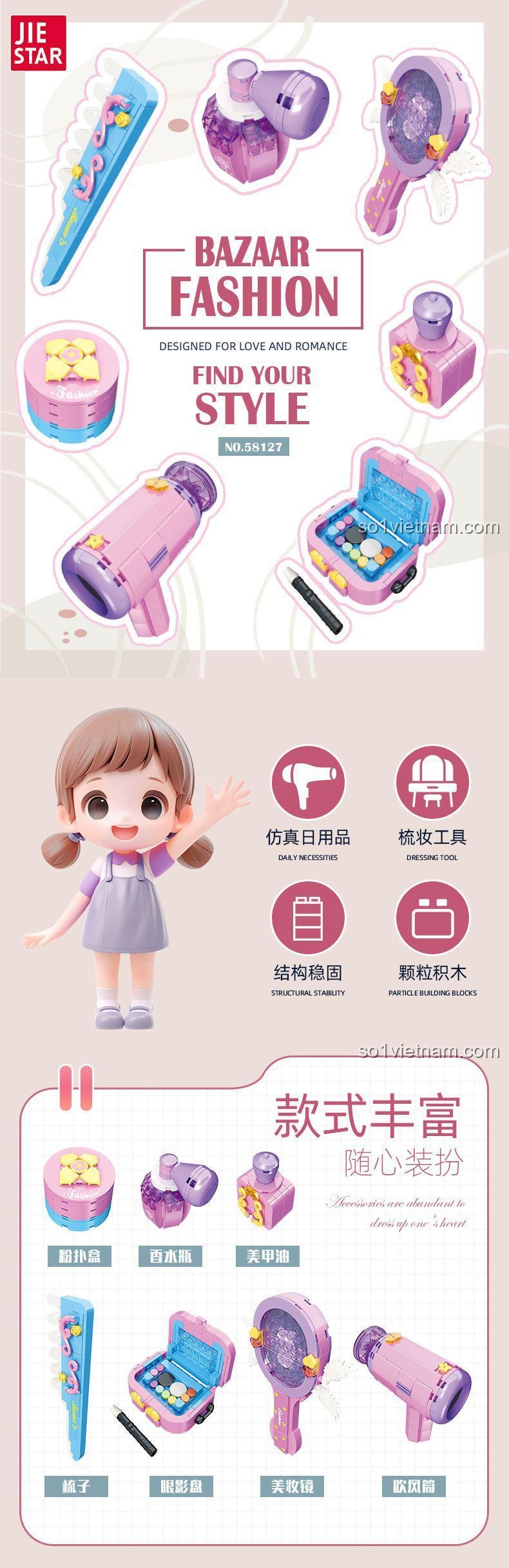 Với tông màu chủ đạo là hồng pastel, tím và trắng, bộ đồ chơi Bazaar Fashion JIESTAR 58127 mang đến một vẻ ngoài ngọt ngào, nữ tính, hoàn hảo cho các bé gái. Các chi tiết được thiết kế mô phỏng chân thực các vật dụng trang điểm quen thuộc như máy sấy tóc, gương soi, bảng phấn mắt, chai nước hoa, lược chải tóc, và hộp đựng mỹ phẩm. Kích thước các mảnh ghép vừa vặn, dễ dàng cho bé cầm nắm và lắp ráp. Tỉ lệ mô hình được thiết kế hợp lý, tạo cảm giác như một bộ trang điểm thu nhỏ, giúp bé dễ dàng hình dung và nhập vai.