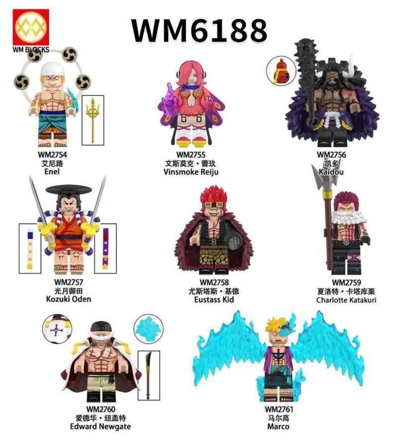 Bộ sưu tập One Piece WM6188 bao gồm 8 minifigure nhân vật đình đám từ thế giới One Piece. Đó là Enel, Vinsmoke Reiju, Kaido, Kozuki Oden, Eustass Kid, Charlotte Katakuri, Edward Newgate (Râu Trắng) và Marco. Đây là một bộ sưu tập đa dạng, mang đến nhiều lựa chọn cho bé để tái hiện các cảnh phim yêu thích hoặc tạo ra câu chuyện mới.