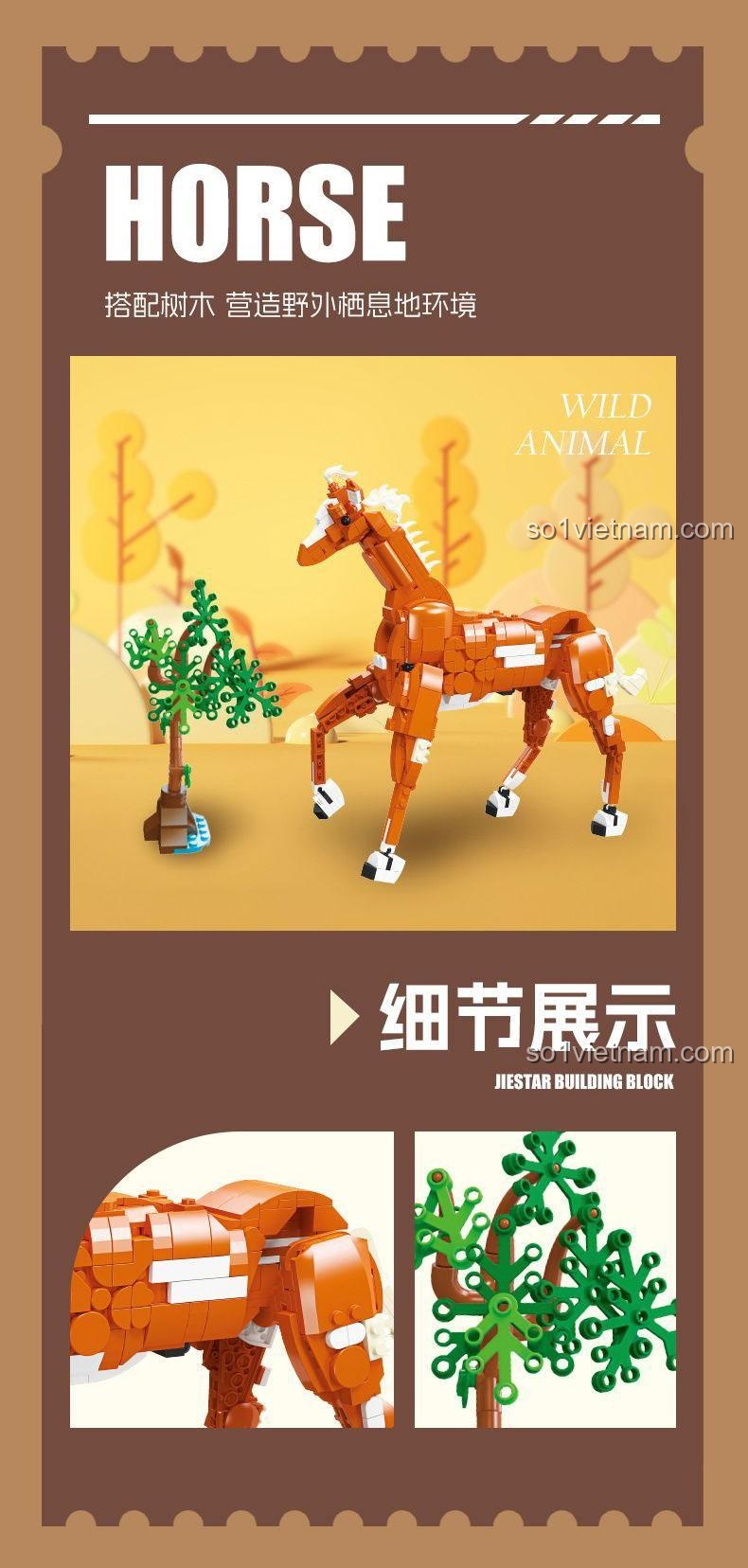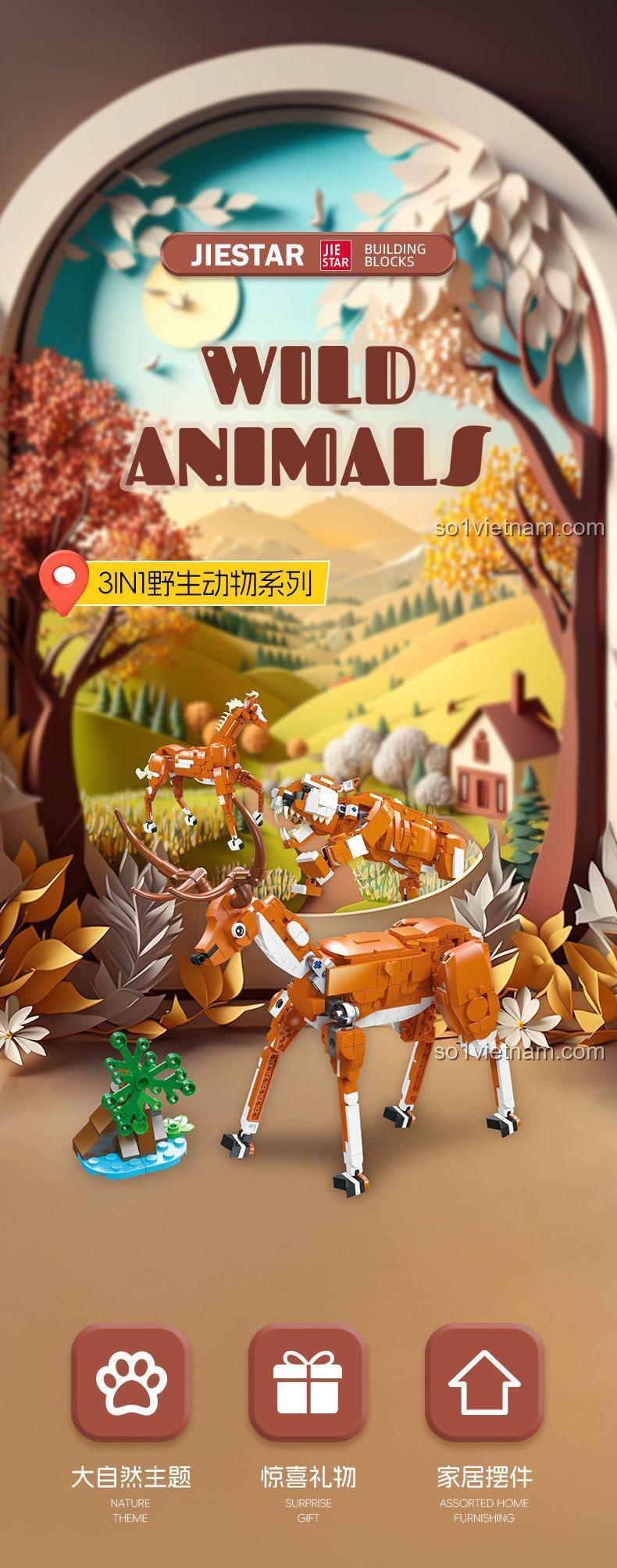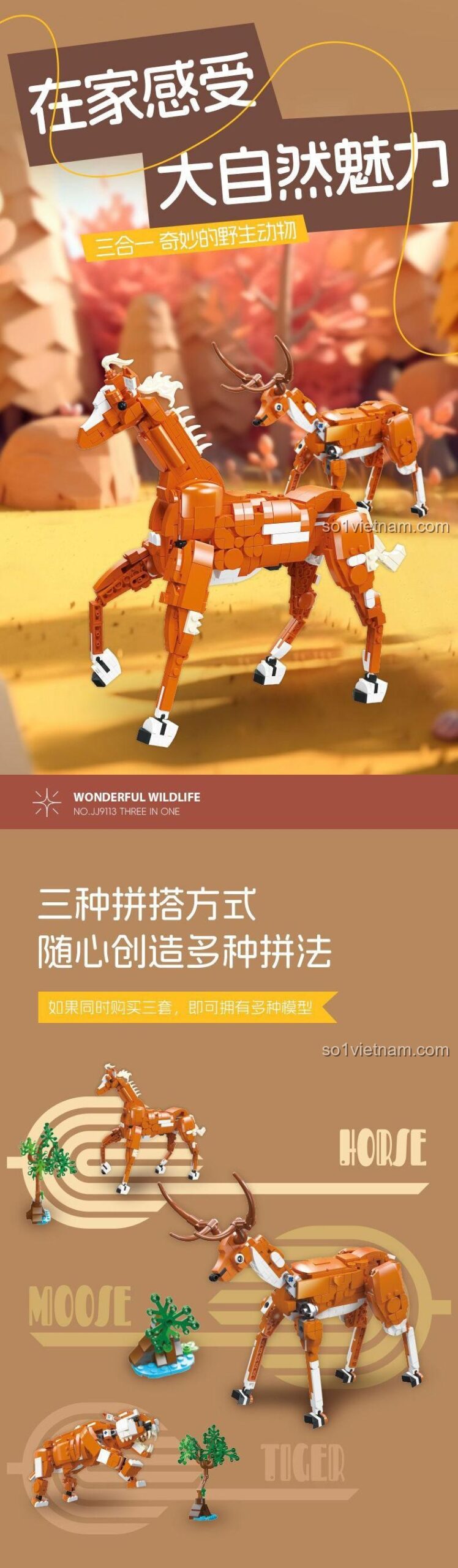 Bộ lắp ghép JIESTAR JJ9113 cho phép bé lắp ráp được 3 mẫu động vật hoang dã: Hổ, Ngựa và Nai.