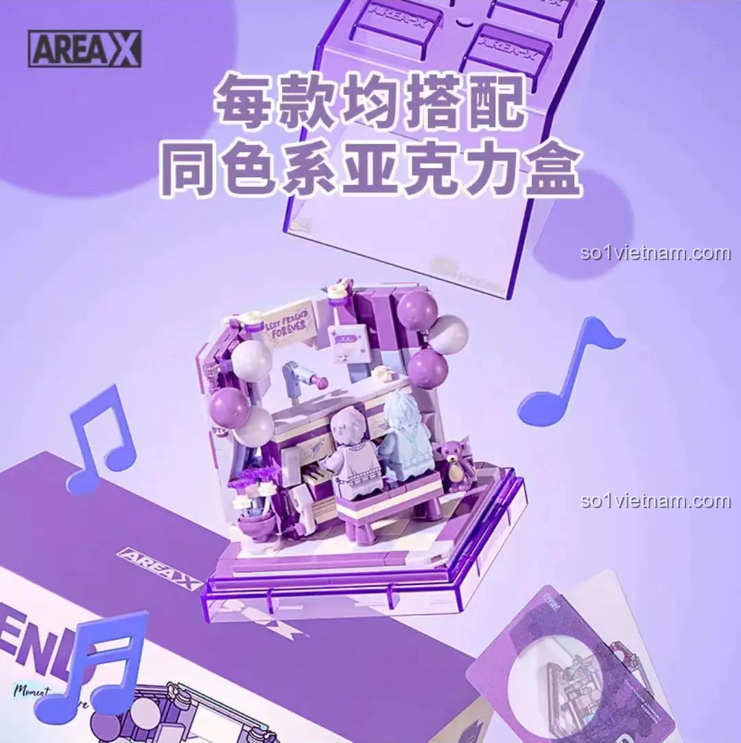 Bộ đồ chơi lắp ghép Mô hình piano tình bạn AREA-X AX0094 gây ấn tượng mạnh mẽ với thiết kế tinh xảo và màu sắc chủ đạo là tím và trắng, tạo nên một tổng thể hài hòa và lãng mạn. Mô hình bao gồm một chiếc đàn piano mini, hai nhân vật nhỏ nhắn đang ngồi cạnh nhau, cùng những chi tiết trang trí đáng yêu như bóng bay và chậu cây nhỏ. Tất cả được đặt trong một hộp trưng bày acrylic trong suốt, không chỉ bảo vệ mô hình mà còn biến nó thành một vật trang trí đẹp mắt cho bất kỳ không gian nào. Với kích thước nhỏ gọn 10.8 x 10.8 x 12.1 cm, mô hình này dễ dàng đặt trên bàn học, kệ sách hay tủ trưng bày. Từng chi tiết nhỏ được chăm chút tỉ mỉ, từ phím đàn piano đến biểu cảm của các nhân vật, tất cả đều góp phần tạo nên một tác phẩm nghệ thuật thu nhỏ, thể hiện sự khéo léo và tinh tế trong thiết kế của AREA-X.