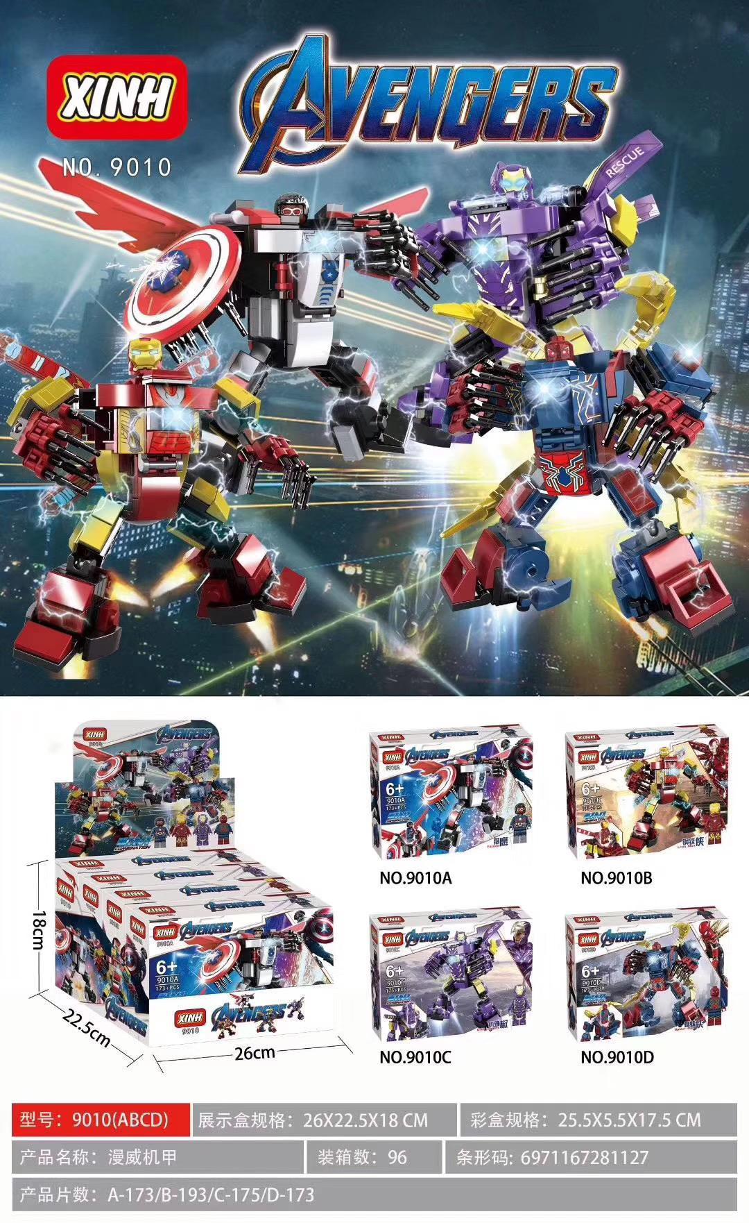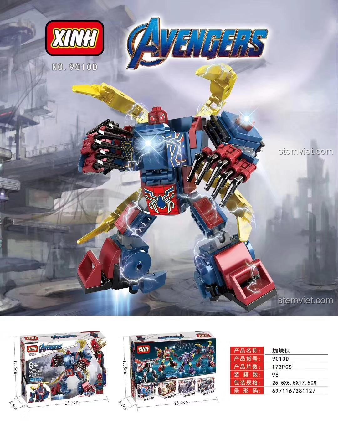 Bộ lắp ghép Avengers XINH 9010 cho phép bé lắp ráp thành 4 mẫu robot siêu anh hùng khác nhau: Captain America Mech, Iron Man Mech, Pepper Potts Rescue Mech và Spider-Man Mech.
