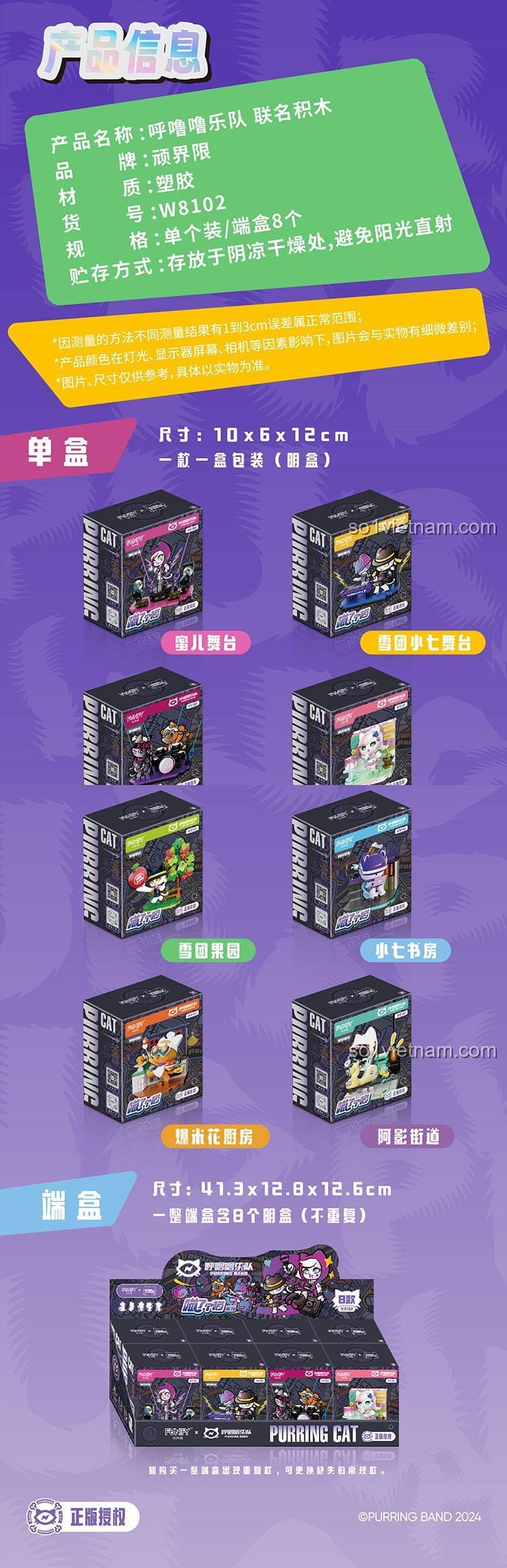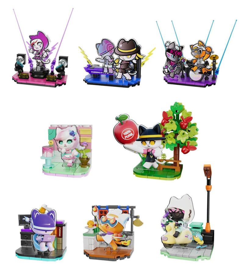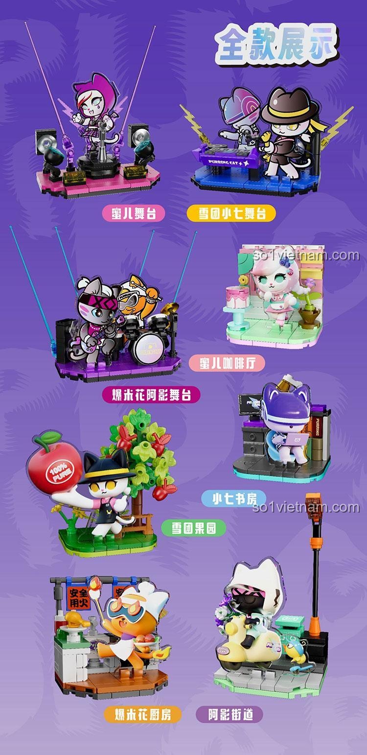 Bộ lắp ghép FUNIFY W8102 “Hô Hô Hô” Ban Nhạc Mèo bao gồm 8 mẫu độc đáo: Sân khấu biểu diễn, Sân khấu piano, Sân khấu trống, Quán cà phê, Vườn cây, Thư phòng, Bếp và Đường phố.