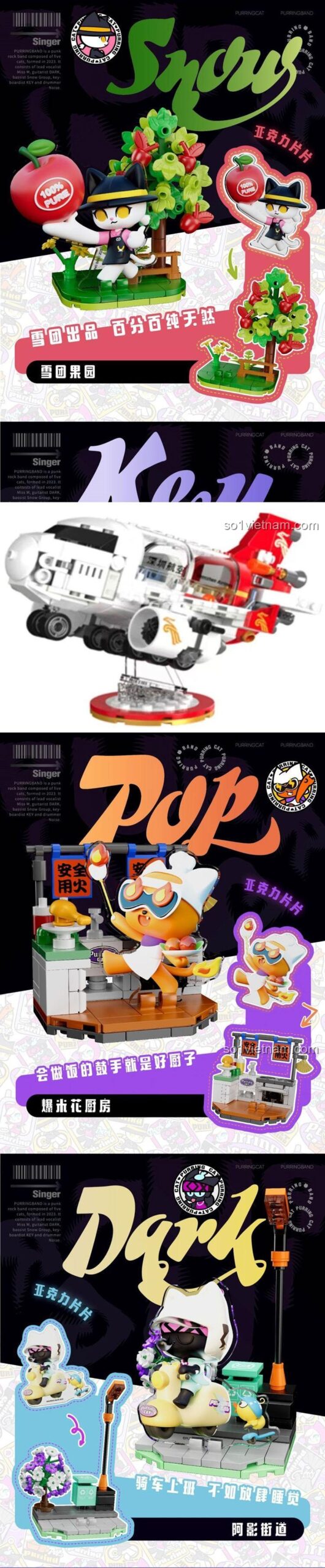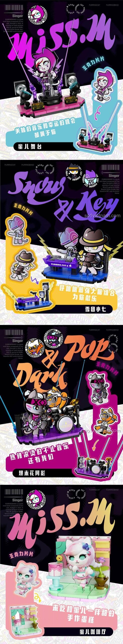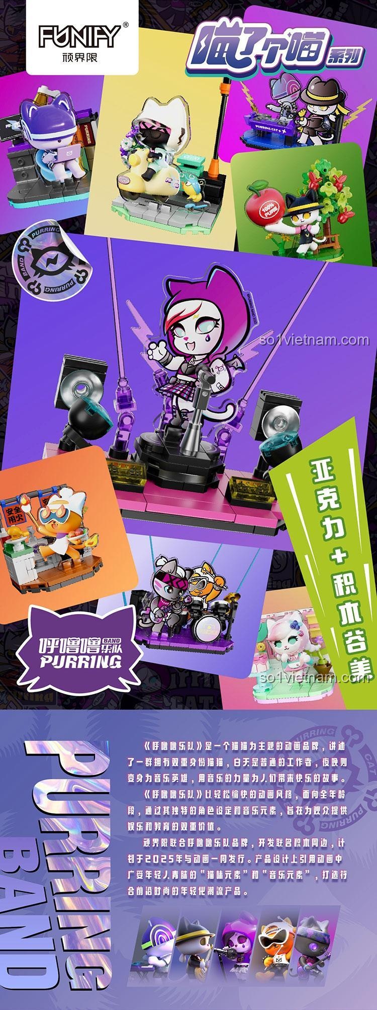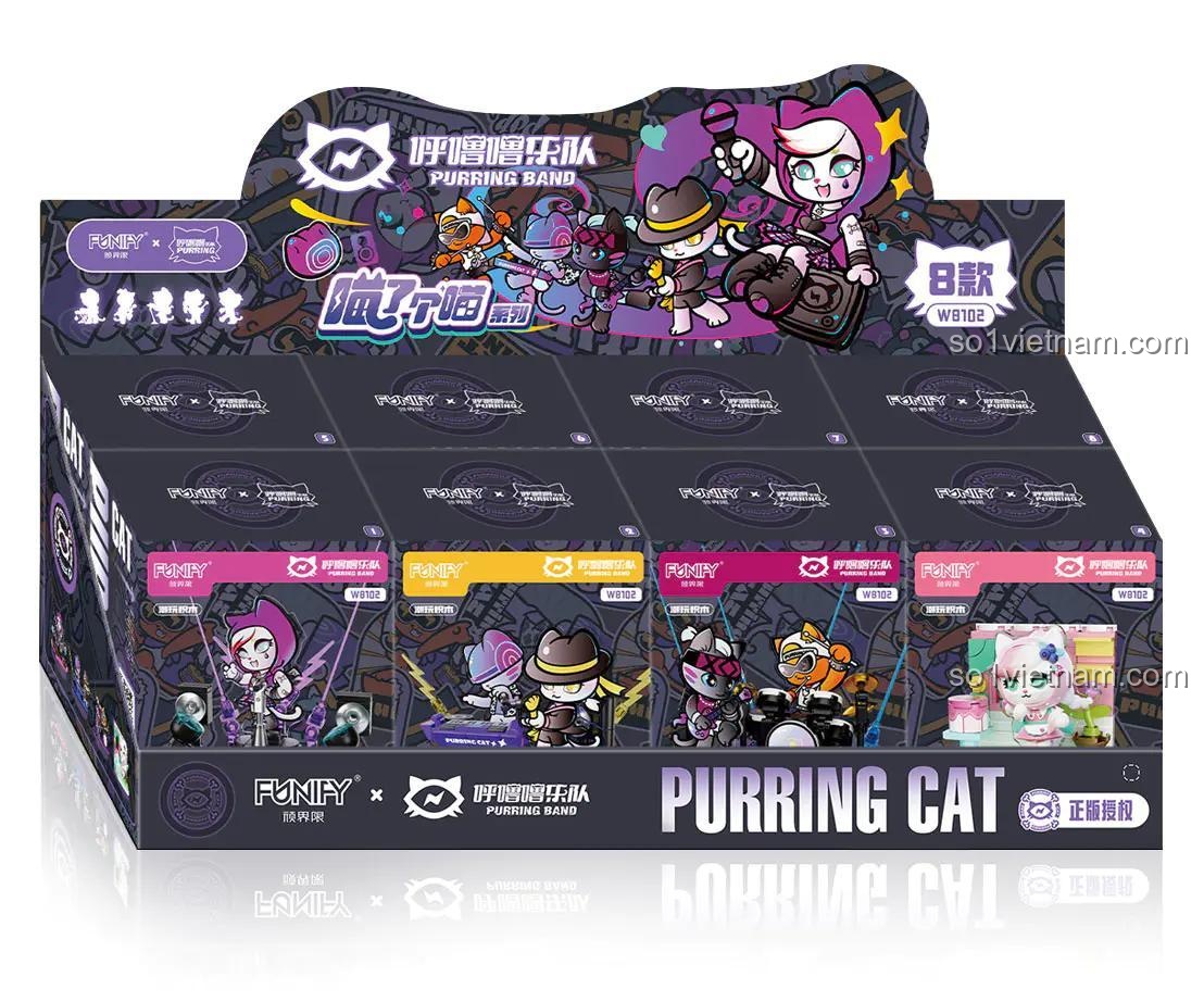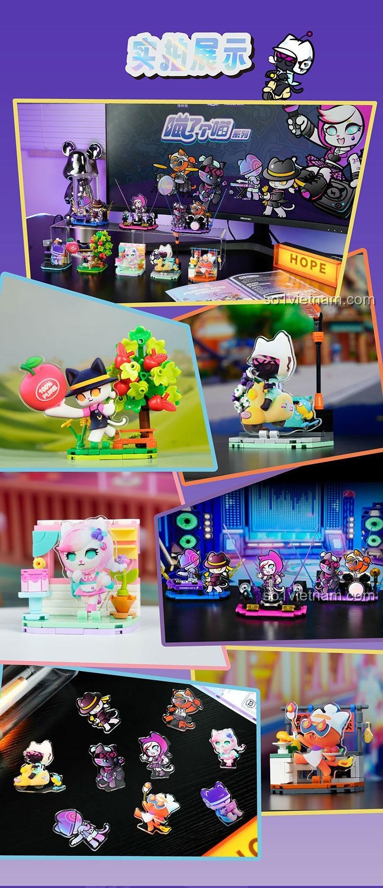 FUNIFY W8102 nổi bật với thiết kế tinh tế và màu sắc tươi sáng, thu hút mọi ánh nhìn. Mỗi mô hình nhỏ được tạo nên từ những viên gạch mini block, đòi hỏi sự tỉ mỉ và khéo léo trong từng thao tác lắp ráp. Các nhân vật mèo được tạo hình ngộ nghĩnh, biểu cảm đa dạng, cùng với các phụ kiện đi kèm như micro, đàn piano, trống, cây xanh, bàn ghế… tất cả đều được chăm chút đến từng chi tiết nhỏ nhất. Màu sắc chủ đạo như hồng, tím, trắng, xanh dương, vàng, cam, đen hòa quyện tạo nên một tổng thể hài hòa, bắt mắt, phù hợp với sở thích của các bé gái. Tỉ lệ mô hình nhỏ gọn, dễ dàng trưng bày trên bàn học, kệ sách, mang đến một không gian đầy màu sắc và cá tính.
