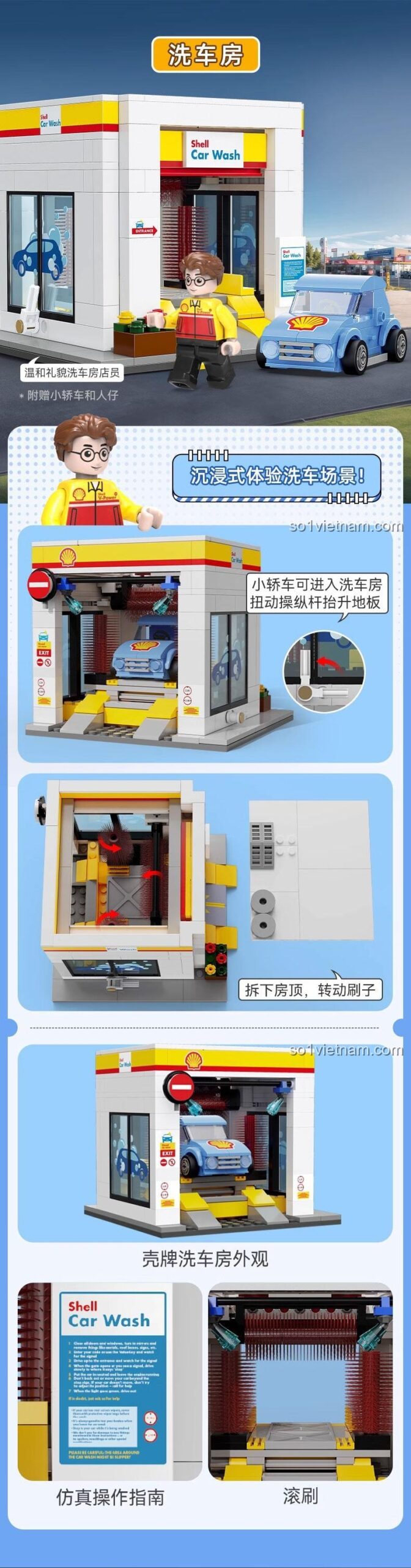 • Quà Tặng Đặc Biệt: Vì mô hình có 1 minifigure Nhân viên rửa xe Shell, chúng tôi sẽ tặng kèm thêm một bộ phụ kiện nhỏ (như cờ lê, bình xịt mini hoặc dụng cụ cầm tay) để nhân vật của bé thêm phần sống động và chân thực!