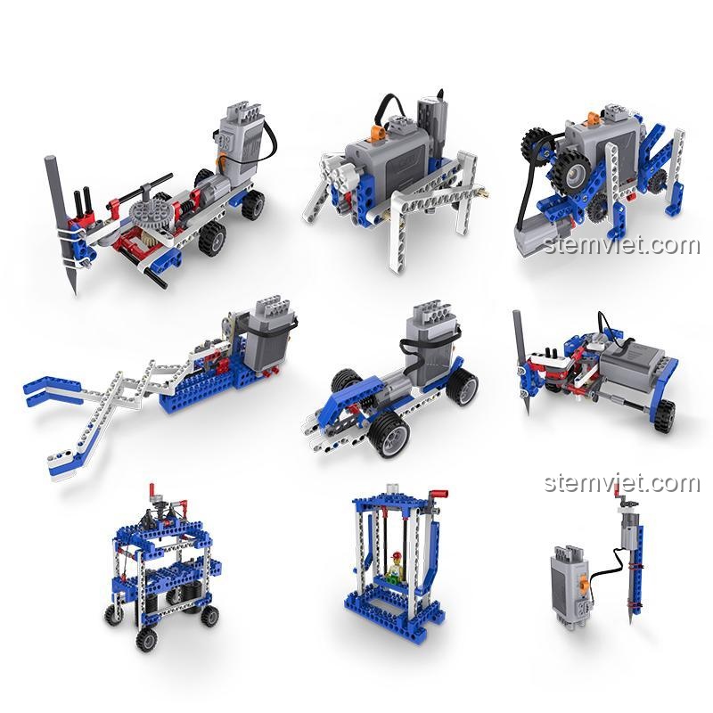 Mặc dù không có kích thước mô hình cụ thể, nhưng qua hình ảnh, chúng ta có thể thấy các mẫu lắp được có tỉ lệ cân đối, thể hiện rõ ràng các cấu trúc cơ khí như bánh răng, đòn bẩy, trục quay. Điều này giúp bé dễ dàng hình dung và hiểu được cách các bộ phận hoạt động cùng nhau. Từ những chiếc xe đơn giản đến các cỗ máy phức tạp hơn, mỗi mô hình đều là một tác phẩm nghệ thuật kỹ thuật, khuyến khích sự sáng tạo và khám phá.