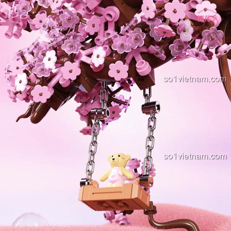 Điểm nhấn độc đáo của bộ lắp ghép Cây Anh Đào Mùa Xuân DUMEC A D1310 chính là chiếc xích đu được thiết kế tinh xảo, có thể đặt chú gấu bông đi kèm vào để tạo nên một khung cảnh vô cùng dễ thương và sinh động. Chiếc xích đu không chỉ là chi tiết trang trí mà còn là yếu tố khơi gợi trí tưởng tượng, giúp bé tạo ra những câu chuyện thú vị về thế giới của chú gấu bông dưới tán cây anh đào. Hồ nước nhỏ bên dưới gốc cây cũng góp phần tạo nên sự sinh động và hài hòa cho tổng thể mô hình.