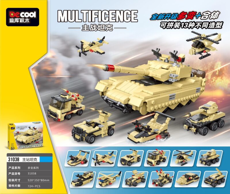 Decool Xe Tăng 31038 có thể biến hình thành 13 loại phương tiện quân sự khác nhau như xe tăng chủ lực, máy bay chiến đấu, trực thăng quân sự, xe tải tên lửa, xe Jeep quân sự, tàu cao tốc quân sự, xe bọc thép, xe pháo tự hành và nhiều mô hình độc đáo khác, giúp bé thỏa sức sáng tạo.