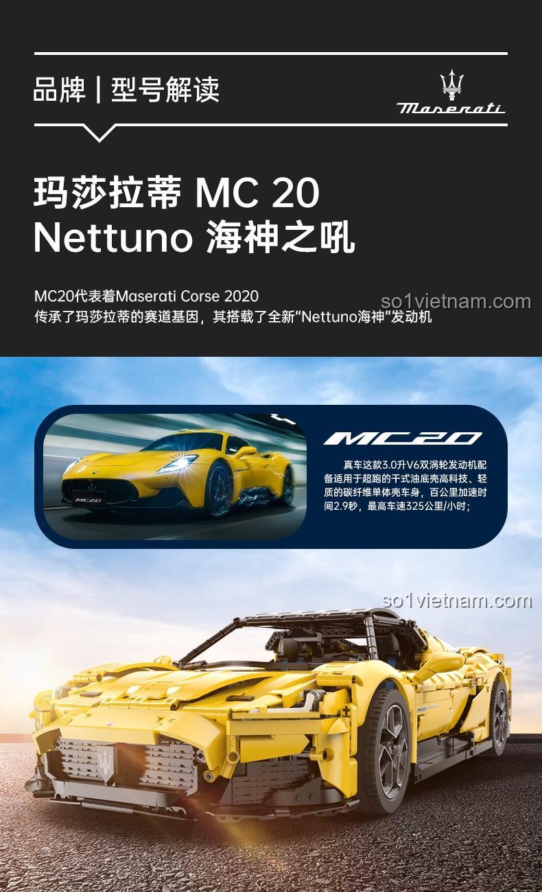 Maserati MC20 Nettuno, hay còn gọi là “Thần tốc Ý”, là minh chứng cho di sản huy hoàng và tinh thần đổi mới không ngừng của thương hiệu Maserati. Ra đời vào tháng 9 năm 2020, MC20 không chỉ kế thừa những giá trị cốt lõi về hiệu suất và thiết kế thể thao, mà còn định hình lại tương lai của dòng siêu xe Maserati. Trái tim của MC20 là khối động cơ V6 Nettuno, một tuyệt tác kỹ thuật với công suất lên đến 630 mã lực, cho phép “chiến mã” này bứt tốc từ 0-100 km/h chỉ trong 2,9 giây và đạt vận tốc tối đa đáng kinh ngạc 325 km/h. Tên gọi “Nettuno” (Thần biển cả Neptune) càng tô đậm thêm sức mạnh và sự uy dũng của chiếc xe. Bộ lắp ghép RASTAR 93500 đã tái hiện một cách xuất sắc vẻ đẹp và sức mạnh này, mang đến cho bạn cơ hội tự tay xây dựng và khám phá từng chi tiết của một huyền thoại.