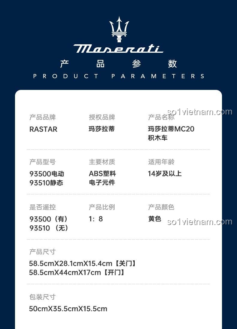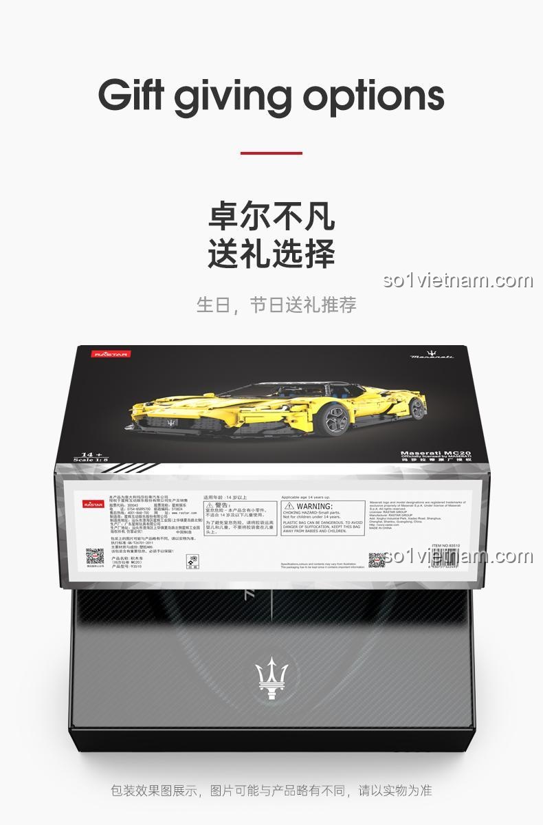 Sở hữu ngay bộ lắp ghép điều khiển từ xa Maserati MC20 Nettuno RASTAR 93500 để mang về một tuyệt tác công nghệ và nghệ thuật. Đây là món quà hoàn hảo cho bất kỳ dịp nào, từ sinh nhật, Giáng sinh, Tết Nguyên Đán đến những phần thưởng xứng đáng cho sự nỗ lực của bé.