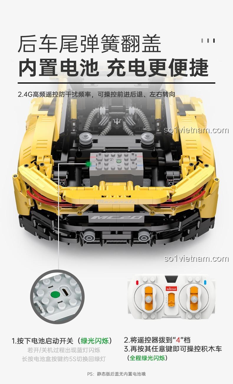 Điểm nhấn đặc biệt của bộ lắp ghép RASTAR 93500 chính là khả năng điều khiển từ xa (RC) mạnh mẽ và ổn định. Sử dụng công nghệ tần số 2.4G, bộ điều khiển cho phép bạn dễ dàng điều khiển chiếc Maserati MC20 của mình di chuyển tiến, lùi, rẽ trái, rẽ phải một cách mượt mà và chính xác. Hệ thống điều khiển này mang đến trải nghiệm lái xe chân thực, giúp bạn thỏa sức khám phá tốc độ và sự linh hoạt của siêu xe ngay trong không gian sống của mình.