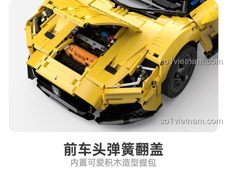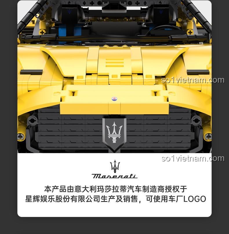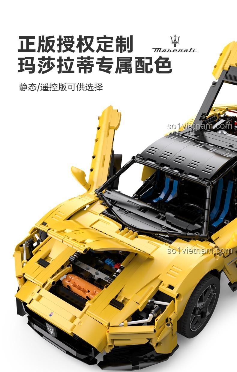 Màu vàng rực rỡ của chiếc xe không chỉ thu hút mọi ánh nhìn mà còn thể hiện sự năng động và cá tính. Các chi tiết nội thất cũng được chăm chút kỹ lưỡng, bao gồm vô lăng, bảng điều khiển, ghế ngồi, mang đến cảm giác như đang bước vào khoang lái của một chiếc siêu xe thực thụ. Bộ lắp ghép này không chỉ là thử thách về kỹ năng mà còn là cơ hội để bạn chiêm ngưỡng vẻ đẹp tinh tế trong từng chi tiết thiết kế của Maserati.