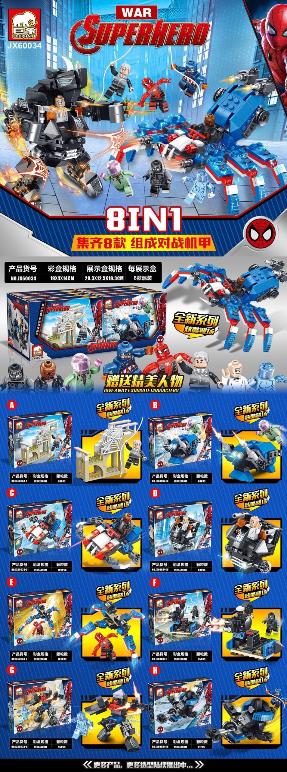 Đặc biệt, khi 8 mô hình nhỏ này hợp thể thành Robot Hợp Thể Lớn, bé sẽ phải trầm trồ trước sự hoành tráng và chi tiết của nó. Các khớp nối linh hoạt cho phép robot có thể tạo ra nhiều tư thế chiến đấu khác nhau, từ tấn công dũng mãnh đến phòng thủ kiên cố, mang lại trải nghiệm chơi vô cùng sống động. Các minifigure siêu anh hùng đi kèm như Spider-Man, Captain America, Iron Man, Black Panther, Venom, Ice Man, Rhino, Nick Fury và Green Goblin đều được thiết kế sắc nét, tái hiện chân thực các nhân vật yêu thích của bé. Bộ đồ chơi lắp ráp Elephant JX60034 này chắc chắn sẽ là điểm nhấn nổi bật trong bộ sưu tập của bất kỳ bé trai nào đam mê siêu anh hùng và robot.