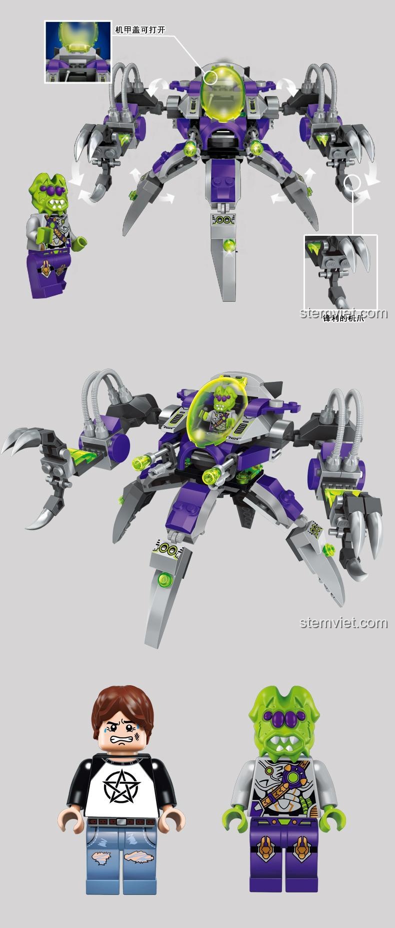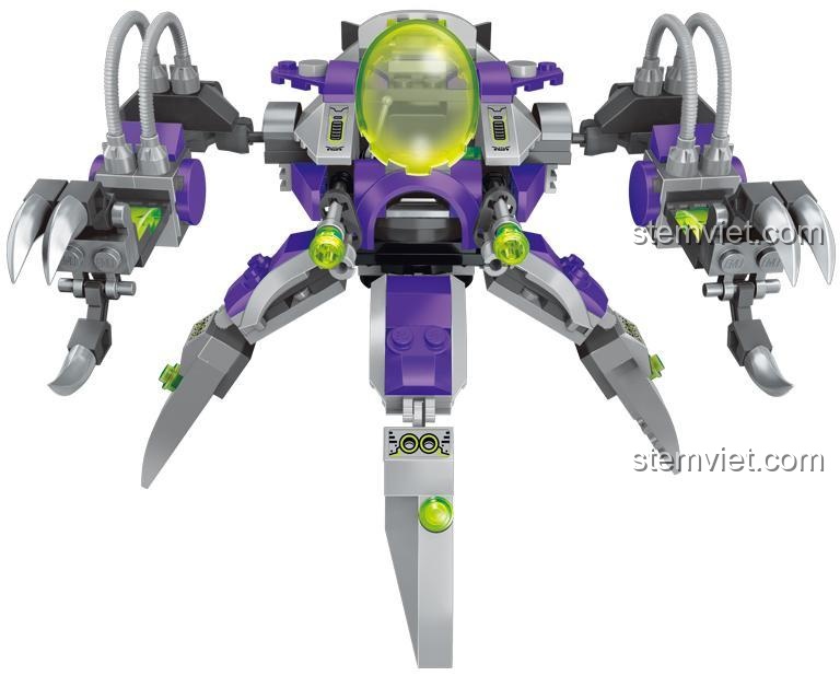 Bộ đồ chơi mô hình Cỗ máy bắt giữ Qman 05 gây ấn tượng mạnh mẽ với thiết kế độc đáo và màu sắc chủ đạo đầy lôi cuốn. Với tông màu tím, xám và xanh lá nổi bật, robot chiến đấu không gian này trông như vừa bước ra từ một bộ phim khoa học viễn tưởng. Cấu trúc đa chân, tựa như một con nhện khổng lồ, mang lại vẻ ngoài mạnh mẽ và linh hoạt. Buồng lái trong suốt cho phép bé dễ dàng đặt minifigure người ngoài hành tinh vào vị trí điều khiển, sẵn sàng cho mọi nhiệm vụ. Đặc biệt, các càng kẹp sắc bén và súng laser được thiết kế tỉ mỉ, tạo nên một cỗ máy chiến đấu hoàn hảo. Đi kèm là hai minifigure chi tiết: một chiến binh không gian dũng cảm (City Boy) và một Alien Soldier B đầy bí ẩn, mỗi nhân vật đều có trang phục và biểu cảm riêng, tăng thêm tính chân thực cho cuộc phiêu lưu. Từng mảnh ghép đều được chăm chút, đảm bảo độ chính xác cao, mang lại trải nghiệm lắp ráp mượt mà và thành phẩm đẹp mắt.
