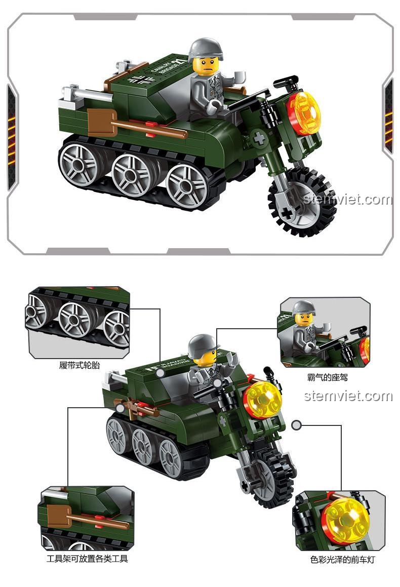 Không chỉ có xe tải, bộ đồ chơi còn đi kèm một chiếc xe mô tô quân sự bánh xích độc đáo, thể hiện sự linh hoạt và khả năng di chuyển trên mọi địa hình. Cùng với đó là 3 minifigures lính quân đội với trang bị đầy đủ và một chú chó nghiệp vụ Keeppley được tạo hình sống động, sẵn sàng tham gia vào mọi nhiệm vụ. Từ những chi tiết nhỏ như đèn pha, bánh xe chống trượt của xe tải đến ghế ngồi hầm hố của xe mô tô, tất cả đều được chăm chút kỹ lưỡng, mang lại trải nghiệm lắp ráp và chơi chân thực nhất cho bé. Bộ xếp hình Lính quân đội QMAN này chắc chắn sẽ làm hài lòng những người chơi khó tính nhất.