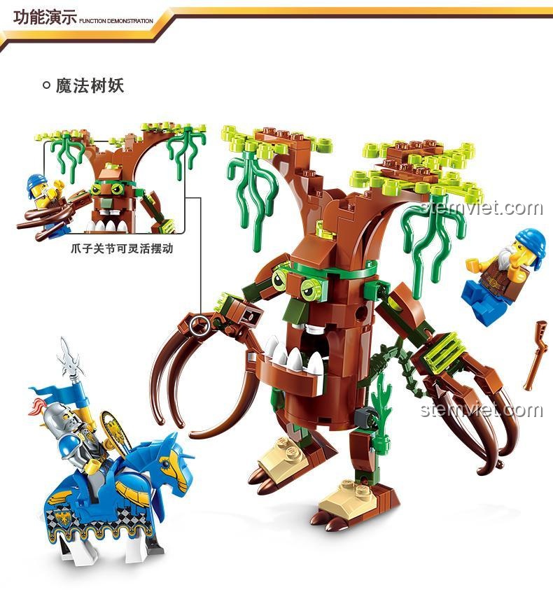 Điểm nhấn nổi bật của bộ đồ chơi mô hình Enlighten 2302 chính là tính năng khớp nối linh hoạt của mô hình Người cây. Các khớp ở móng vuốt và chân tay có thể di chuyển linh hoạt, cho phép bé tạo ra vô số tư thế chiến đấu và hành động khác nhau, từ vây hãm đến phản công. Điều này không chỉ tăng cường tính tương tác mà còn giúp bé phát triển khả năng phối hợp tay mắt và kiểm soát cầm nắm. Với 3 minifigures Hiệp sĩ và Ngựa chiến, bé có thể tái hiện lại những cảnh chiến đấu hoành tráng, tạo nên những câu chuyện đầy kịch tính. Bộ đồ chơi lắp ráp 2302 này không chỉ là một mô hình tĩnh mà là một sân chơi sống động, nơi mỗi chi tiết đều có thể tham gia vào cuộc phiêu lưu của bé.