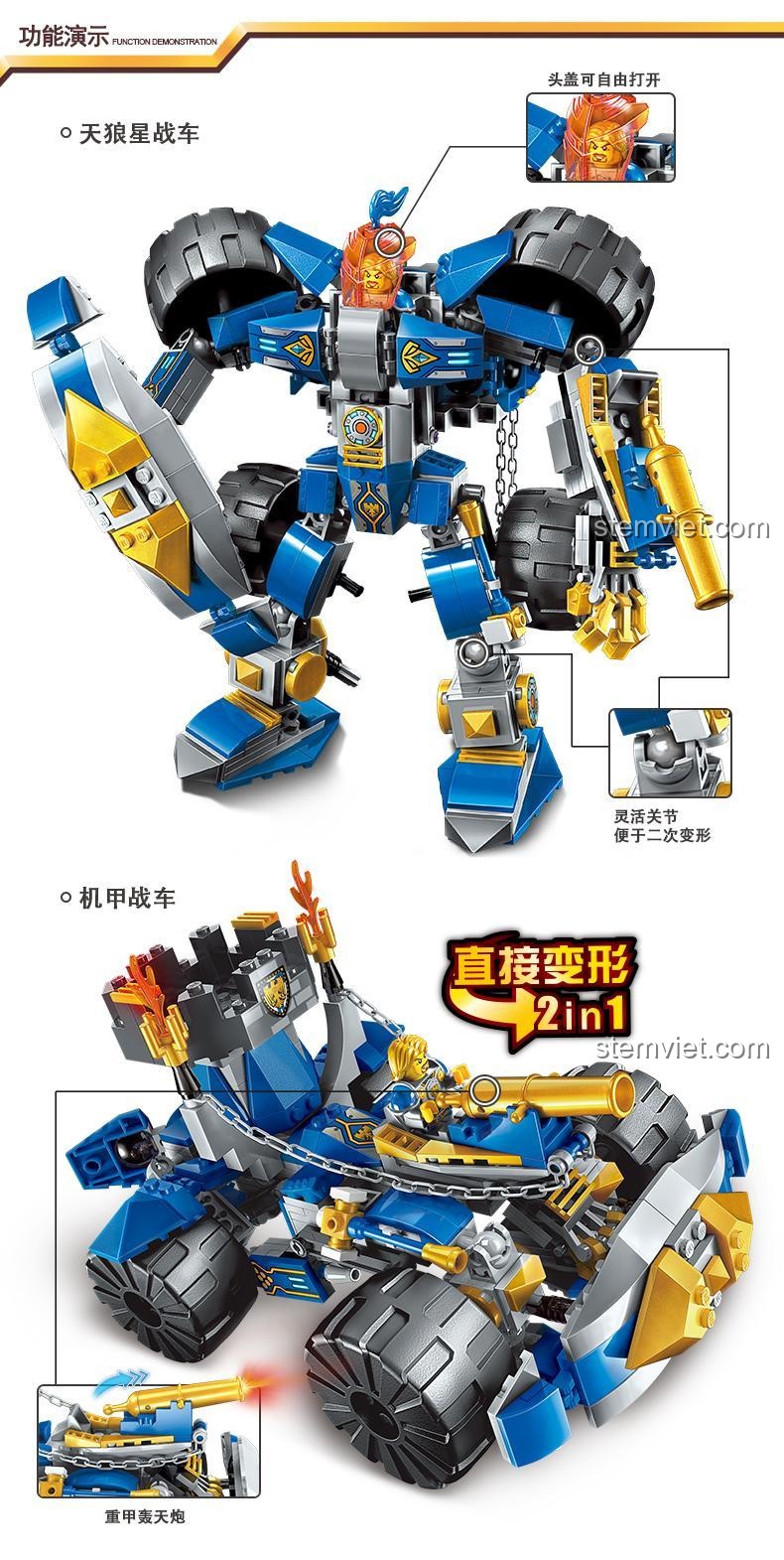 Điểm đặc biệt của bộ đồ chơi lắp ráp Robot Chiến Đấu này là khả năng Biến Hình 2 Trong 1. Từ một Cơ Giáp Hiệp Sĩ dũng mãnh, bé có thể biến đổi thành một Xe Chiến Đấu Thiên Lang mạnh mẽ. Ngoài ra, các khớp linh hoạt cho phép tạo nhiều tư thế chiến đấu ấn tượng.
