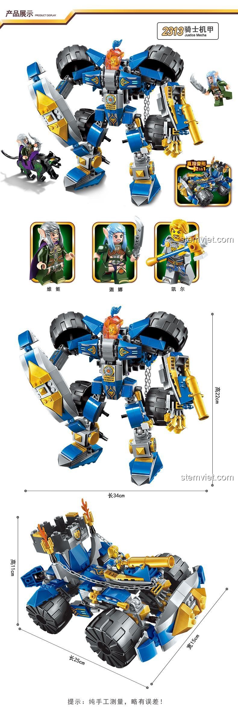Bộ đồ chơi mô hình Enlighten 2313 Cơ Giáp Hiệp Sĩ là một minh chứng cho sự tinh xảo trong thiết kế. Với màu sắc chủ đạo là xanh dương, vàng, xám và đen, mô hình toát lên vẻ mạnh mẽ, hiện đại nhưng vẫn giữ được nét cổ điển của một hiệp sĩ. Khi hoàn thành, Cơ Giáp Hiệp Sĩ có chiều dài 34cm và chiều cao 28cm, tạo nên một hình ảnh ấn tượng, đủ lớn để bé có thể dễ dàng tương tác và điều khiển. Đặc biệt, điểm nhấn nổi bật nhất chính là khả năng Biến Hình 2 Trong 1 độc đáo. Từ một Cơ Giáp Hiệp Sĩ oai vệ, bé có thể biến đổi thành một Xe Chiến Đấu Thiên Lang linh hoạt với chiều dài 25cm, chiều rộng 13cm và chiều cao 10cm. Mỗi chi tiết, từ các khớp nối linh hoạt cho phép tạo nhiều tư thế chiến đấu, đến các bộ phận giáp trụ và vũ khí, đều được chăm chút tỉ mỉ. Chất lượng hoàn thiện cao cấp đảm bảo các mảnh ghép khít chặt, tạo nên một mô hình vững chắc và bền bỉ, sẵn sàng cho mọi trận chiến giả tưởng của bé.