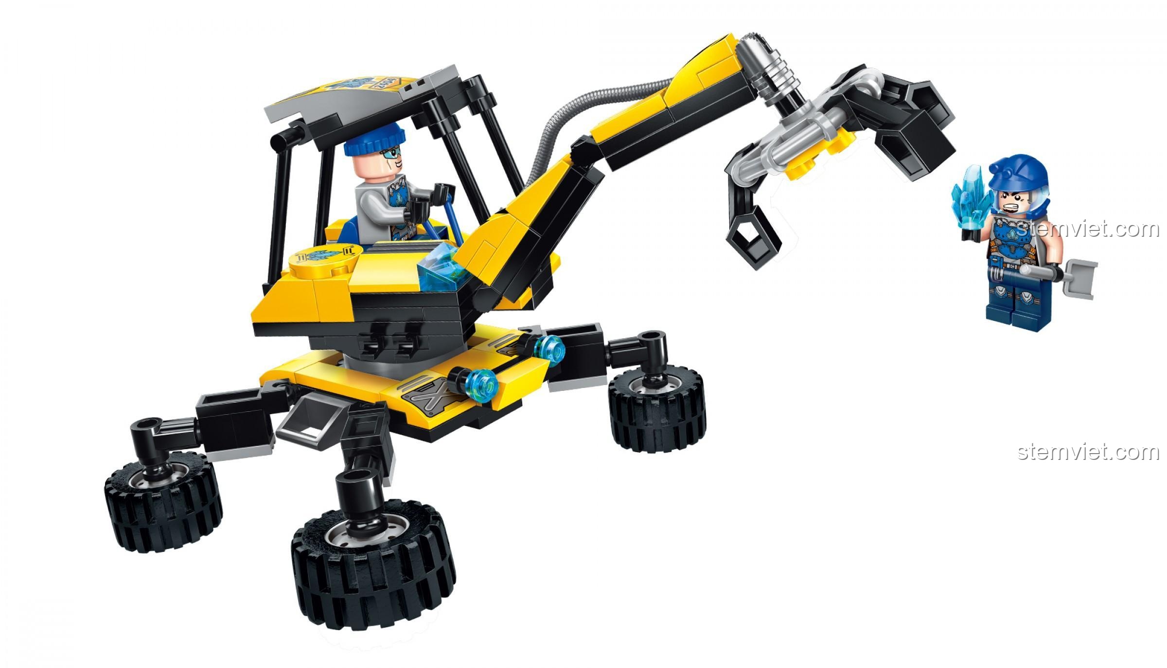 Đồ chơi mô hình Xe Khai Thác Tinh Thể Enlighten 2404 gây ấn tượng mạnh mẽ với thiết kế hiện đại và màu sắc chủ đạo là vàng, đen, cùng những điểm nhấn xanh dương trong suốt, tạo nên vẻ ngoài mạnh mẽ và đầy tính tương lai. Chiếc xe được trang bị một cần cẩu đa năng có khả năng xoay 360 độ, đi kèm với bộ gắp đá linh hoạt, cho phép bé dễ dàng mô phỏng các thao tác khai thác. Đặc biệt, hệ thống bánh xe biến hình độc đáo là điểm nhấn, giúp xe có thể thích nghi với mọi loại địa hình, từ những con đường gồ ghề đến những vách đá cheo leo. Từng chi tiết của mô hình được chăm chút tỉ mỉ, từ buồng lái với ghế ngồi cho minifigure Lý và Ba Đức, đến các đường ống và khớp nối, tất cả đều góp phần tạo nên một cỗ máy khai thác chân thực và sống động, kích thích trí tò mò và khả năng quan sát của bé.