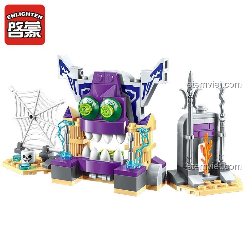 Bộ xếp hình Yêu quái Enlighten 2501 được thiết kế tỉ mỉ để tái hiện chân thực bối cảnh “Hang Yêu Động” trong phim “Anh Em Hồ Lô”. Với màu sắc chủ đạo là tím và xám, mô hình hang yêu quái nổi bật với những chi tiết độc đáo như đôi mắt xanh lá rực rỡ, hàm răng sắc nhọn và những cột trụ cổ kính. Đặc biệt, bộ đồ chơi còn đi kèm với 2 minifigures sống động: Lục Oa (Hồ Lô Thứ Sáu) với khả năng tàng hình và Quân lính Ếch trung thành của yêu quái, cùng với cây giáo sắc bén. Mạng nhện và xương sọ trang trí càng làm tăng thêm không khí bí ẩn, kịch tính của hang động. Từng mảnh ghép được gia công chính xác, đảm bảo độ khít hoàn hảo khi lắp ráp, mang đến một mô hình hoàn chỉnh ấn tượng, sẵn sàng cho những cuộc chiến đấu đầy cam go. Đây là một đồ chơi mô hình Hang yêu quái chân thực, giúp bé thỏa sức sáng tạo và nhập vai.
