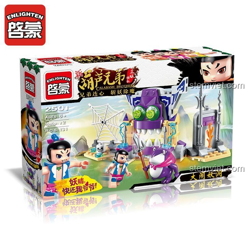 Bộ lắp ghép 2501 không chỉ là một mô hình tĩnh mà còn là một sân chơi tương tác đầy thú vị. Bé có thể tự tay lắp ráp hang yêu quái, sắp xếp các nhân vật Lục Oa và Quân lính Ếch vào các vị trí khác nhau để tái hiện lại những cảnh chiến đấu kinh điển từ bộ phim “Anh Em Hồ Lô”. Với cây giáo đi kèm, bé có thể tạo ra những pha hành động kịch tính, tưởng tượng Lục Oa đang chiến đấu dũng cảm để giải cứu ông nội. Các chi tiết như mạng nhện và xương sọ cũng góp phần tạo nên một không gian chơi đầy kịch tính và hấp dẫn. Bộ đồ chơi Anh em Hồ Lô Enlighten này khuyến khích bé tự do sáng tạo, không bị gò bó bởi một kịch bản cố định. Bé có thể tự nghĩ ra những câu chuyện mới, những cuộc phiêu lưu khác cho các nhân vật, từ đó phát triển khả năng kể chuyện và tư duy logic.