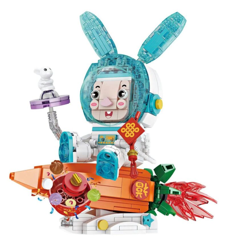 Điểm nhấn độc đáo của bộ lắp ghép này là thiết kế Thỏ Biubiu phi hành gia với đầu có thể lắc lư (bobble head), cùng tên lửa hình củ cà rốt và các chi tiết trang trí mang đậm không khí Tết, tạo nên sự khác biệt và thu hút.