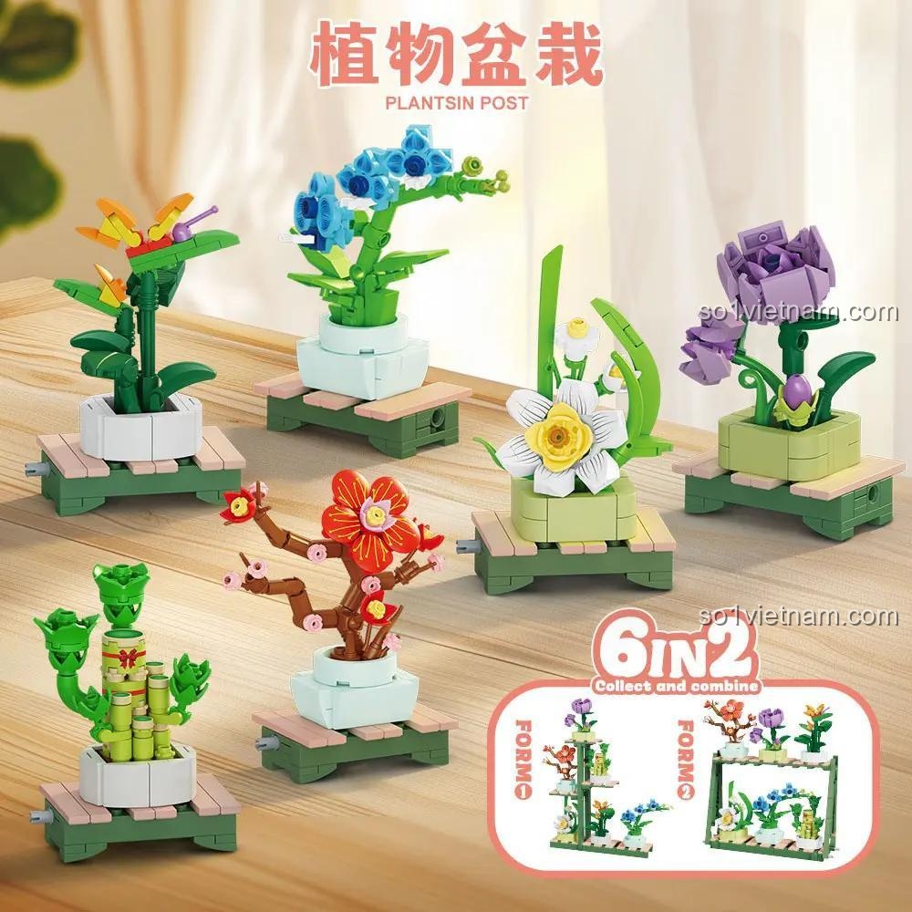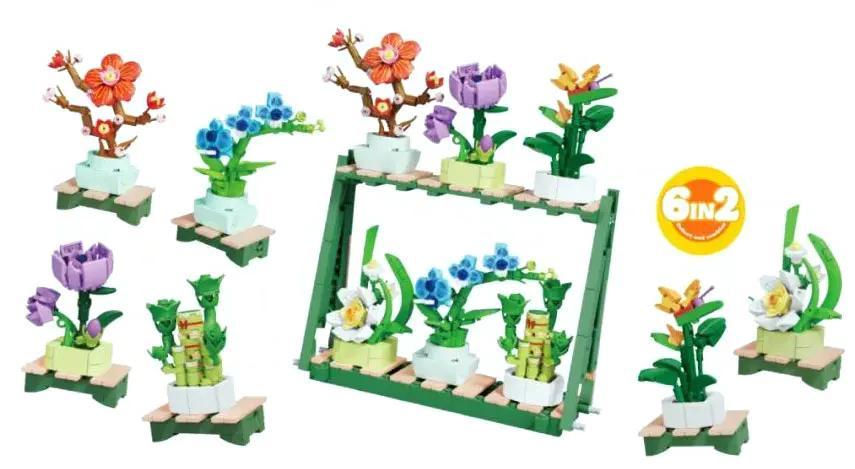 Bộ đồ chơi mô hình 8162 này cho phép bé lắp ráp 6 mẫu cây cảnh mini độc đáo: Phú Quý Trúc, Lan Hoa, Thủy Tiên, Mai Hoa, Thiên Đường Điểu và Nguyệt Quý. Ngoài ra, bé còn có thể sáng tạo sắp xếp chúng trên kệ trưng bày đi kèm hoặc kết hợp theo ý thích riêng.