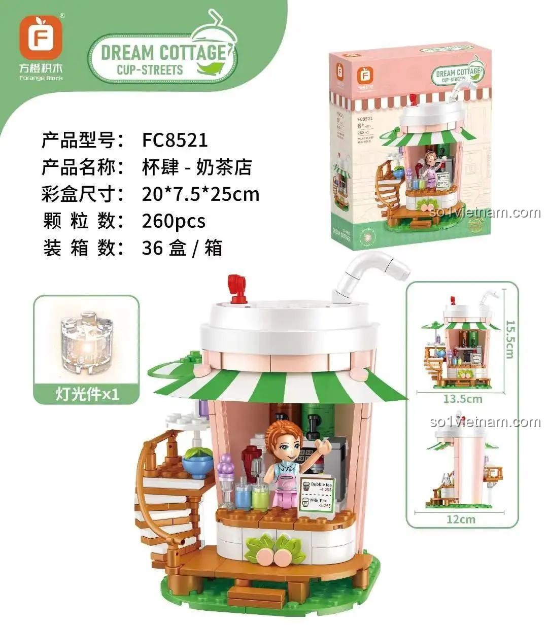 Bộ lắp ghép Forange FC8521 Tiệm Trà Sữa Cup Street (260 chi tiết) – Thế Giới Trà Sữa và Có Đèn LED