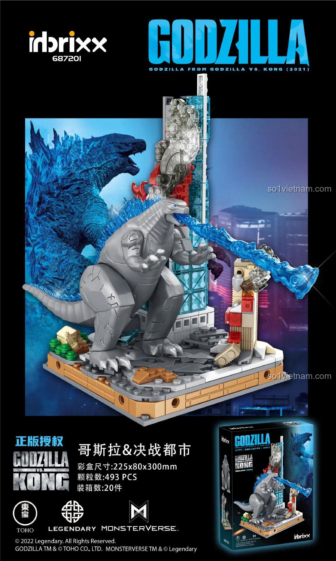 Bộ lắp ghép inbrixx 687201 Godzilla vs. Kong: Trận Chiến Đô Thị nổi bật với mô hình Godzilla có khả năng phun tia năng lượng xanh lam, cùng với bối cảnh đô thị có các chi tiết có thể tháo rời, mô phỏng cảnh thành phố bị tàn phá trong trận chiến.