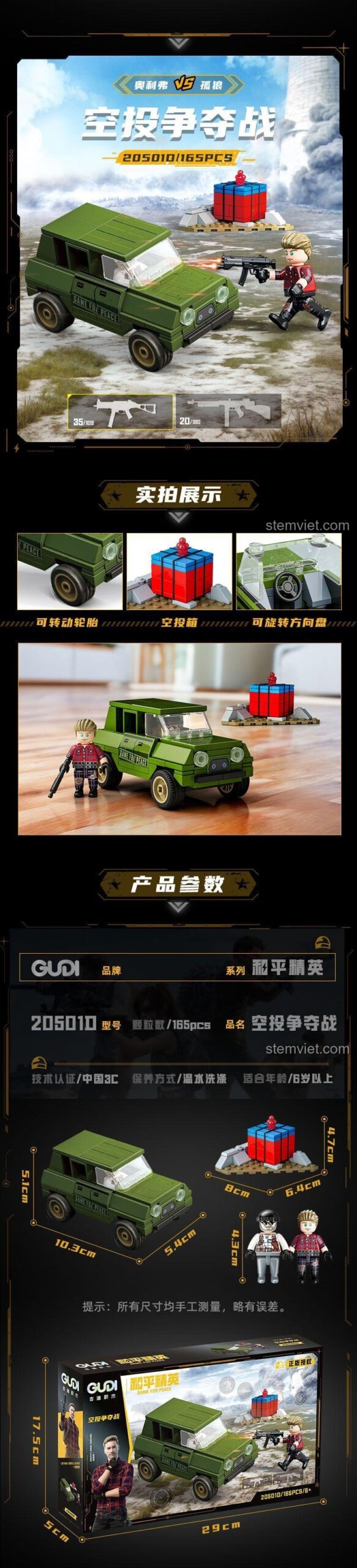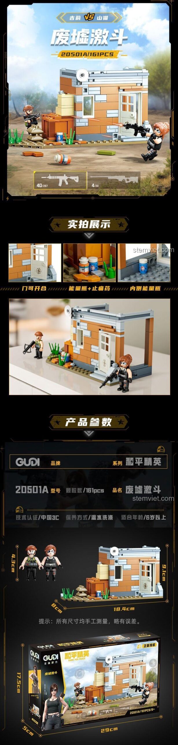 Bộ đồ chơi mô hình GUDI 20501 bao gồm 4 mô hình nhỏ riêng biệt, mỗi mô hình là một phần của bối cảnh chiến trường: Tòa nhà đổ nát, Điểm cố thủ, Đấu súng và một chiếc Xe Jeep quân sự. Tòa nhà đổ nát và Điểm cố thủ được thiết kế với những bức tường đổ vỡ, cửa sổ bị phá hủy, tạo cảm giác chân thực như một khu vực bị bỏ hoang trong game. Chiếc Xe Jeep quân sự với màu xanh lá đặc trưng, bánh xe có thể di chuyển, sẵn sàng đưa các chiến binh đến mọi ngóc ngách của chiến trường.