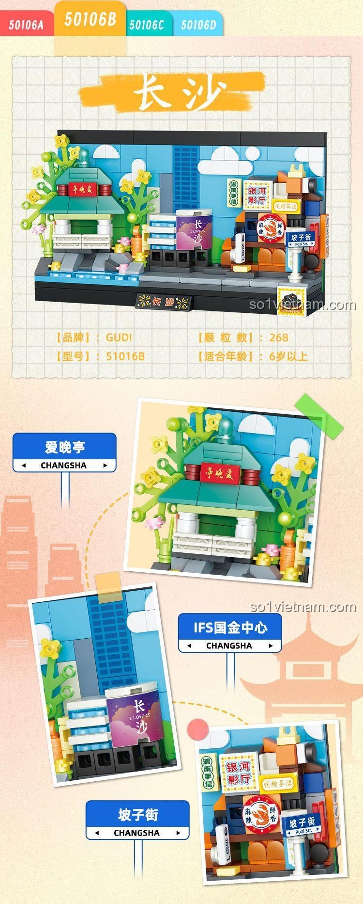 Khi nhìn vào bộ xếp hình 51016 này, mẹ sẽ phải trầm trồ trước sự tỉ mỉ trong từng chi tiết. Mỗi mô hình trong bộ Bưu Thiếp Thành Phố GUDI đều là một tác phẩm nghệ thuật thu nhỏ, tái hiện chân thực các địa danh nổi tiếng với màu sắc chủ đạo hài hòa như xanh dương của bầu trời, xanh lá của cây cối, nâu của những mái nhà cổ kính, trắng của mây và xám của đường phố. Mô Hình Kiến Trúc Trung Hoa 51016A Trùng Khánh, ví dụ, tái hiện Ga tàu điện trên cao Liziba, Cầu Trường Giang Bạch Cư Tự, Hồng Nhai Động và Triều Thiên Môn với chiều dài 17.9cm, rộng 4.4cm và cao 9.6cm. Các mô hình khác như Trường Sa, Tây An, Cáp Nhĩ Tân cũng có kích thước tương tự, đảm bảo độ chi tiết cao và dễ dàng trưng bày. Từng mảnh ghép được thiết kế để khớp nối hoàn hảo, tạo nên một tổng thể vững chắc và đẹp mắt. Đây chắc chắn sẽ là điểm nhấn ấn tượng trong phòng của bé, khơi gợi niềm đam mê kiến trúc và du lịch.
