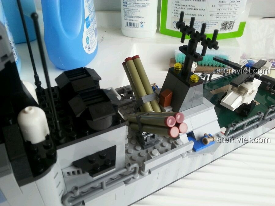 Từng mảnh ghép của bộ đồ chơi mô hình GUDI 8026 Tàu Hộ Vệ Tên Lửa Hùng Mạnh đều được chăm chút tỉ mỉ, từ hệ thống pháo xoay linh hoạt ở mũi và thân tàu, các ống phóng tên lửa uy lực, cho đến cầu tàu với bảng điều khiển in sẵn chi tiết. Đặc biệt, mô hình còn đi kèm một chiếc trực thăng nhỏ, sẵn sàng cất cánh từ sàn đáp, tăng thêm tính chân thực và khả năng chơi cho bé. Các chi tiết vũ khí như súng máy, súng trường, súng lục và ống nhòm cũng được trang bị đầy đủ cho 4 minifigures lính hải quân, giúp bé thỏa sức sáng tạo các kịch bản chiến đấu và bảo vệ biển đảo.