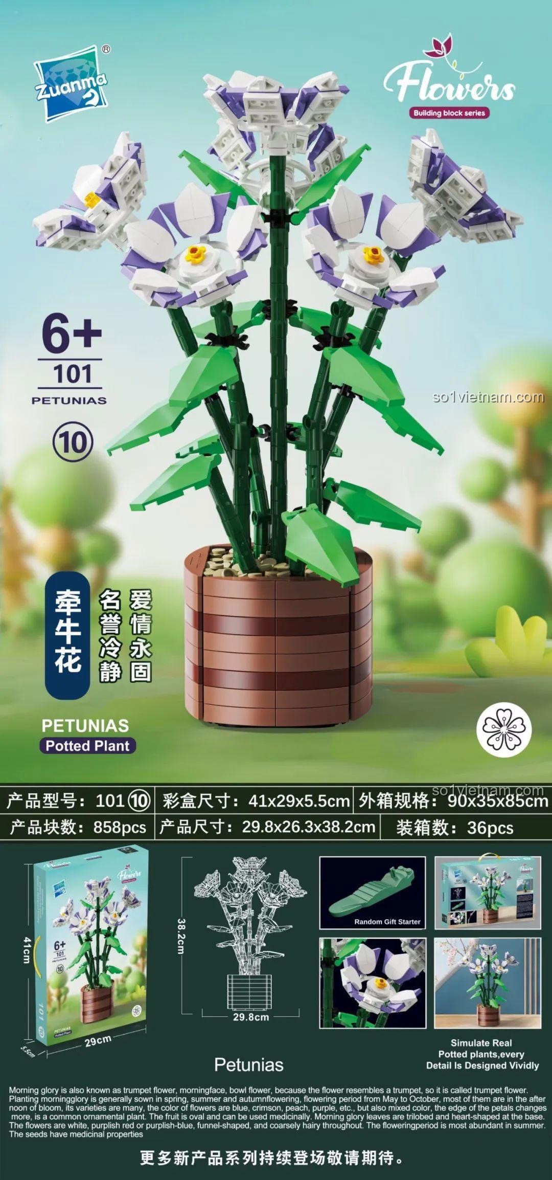 Bộ lắp ghép Zuanma 101-10 tái hiện chân thực vẻ đẹp mong manh và quyến rũ của hoa Petunias. Với 858 mảnh ghép, bạn có thể tự tay tạo ra một chậu hoa Petunias sống động, với những cánh hoa trắng tím xen kẽ, nhụy hoa vàng rực rỡ và những chiếc lá xanh mướt. Mô hình hoàn chỉnh cao tới 38.2cm, trở thành điểm nhấn trang trí độc đáo cho không gian phòng khách, phòng ngủ hay bàn làm việc của bạn. Đây là sự kết hợp hoàn hảo giữa nghệ thuật và đồ chơi, mang đến trải nghiệm thư giãn và thỏa mãn cho mọi lứa tuổi.