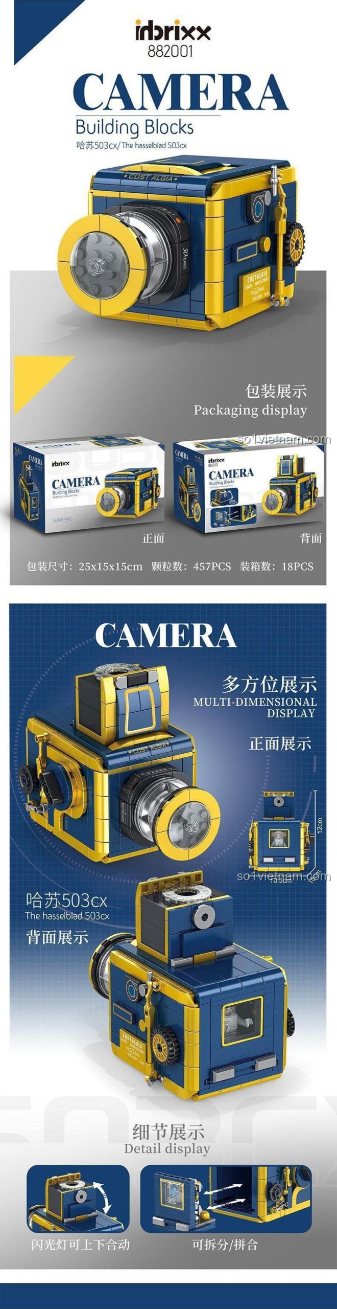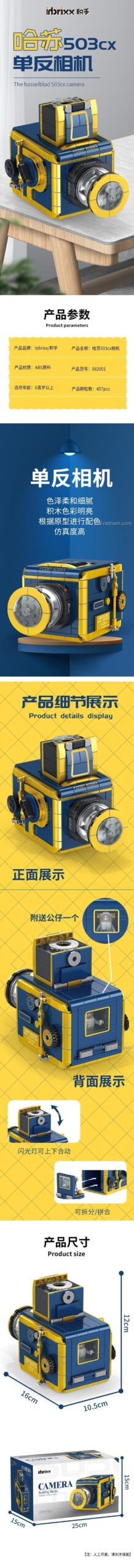 Mỗi chi tiết của bộ xếp hình Máy ảnh cổ điển inbrixx 882001 đều được chăm chút tỉ mỉ, tái hiện chân thực vẻ đẹp vượt thời gian của chiếc Hasselblad 503cx. Với màu xanh dương và vàng chủ đạo, mô hình toát lên vẻ sang trọng và cổ điển, thu hút mọi ánh nhìn. Kích thước mô hình sau khi hoàn thiện là 12cm (dài) x 16cm (rộng) x 10.5cm (cao), vừa vặn để trưng bày trên bàn học, kệ sách hay bất kỳ không gian nào.