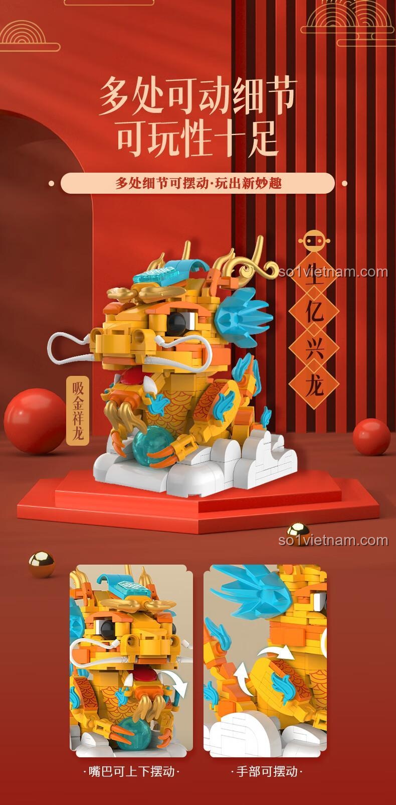 Mô hình Rồng Thần JAKI JK5137 nổi bật với các chi tiết cử động linh hoạt. Miệng của rồng có thể đóng mở, và các chi tiết ở tay cũng có thể xoay, giúp bé tạo ra nhiều tư thế và biểu cảm sống động cho linh vật của mình. Đây là một điểm nhấn đặc biệt của đồ chơi xây dựng Linh vật Rồng này.