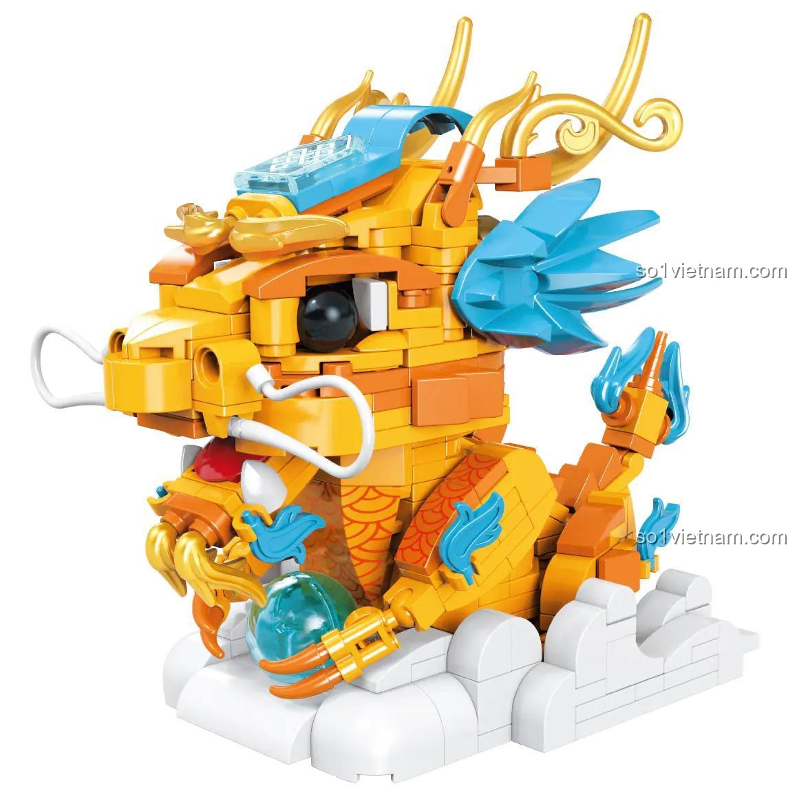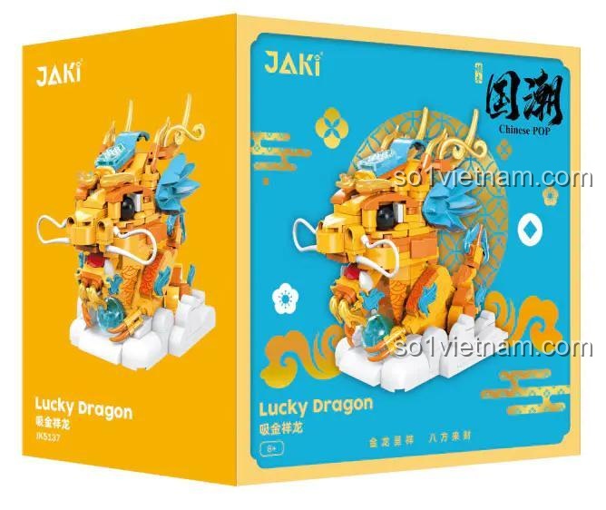 Bộ xếp hình JAKI JK5137 Rồng Thần May Mắn gây ấn tượng mạnh mẽ ngay từ cái nhìn đầu tiên với thiết kế tinh xảo và màu sắc rực rỡ. Mô hình được phối màu chủ đạo là vàng và cam, tượng trưng cho sự giàu sang, phú quý và năng lượng tích cực, kết hợp hài hòa với các chi tiết xanh dương và trắng, tạo nên một tổng thể vừa uy nghi vừa tươi sáng. Từng mảnh ghép được chăm chút tỉ mỉ, tái hiện chân thực hình ảnh một chú rồng thần với vảy rồng lấp lánh, sừng rồng uốn lượn và bộ râu dài mềm mại.