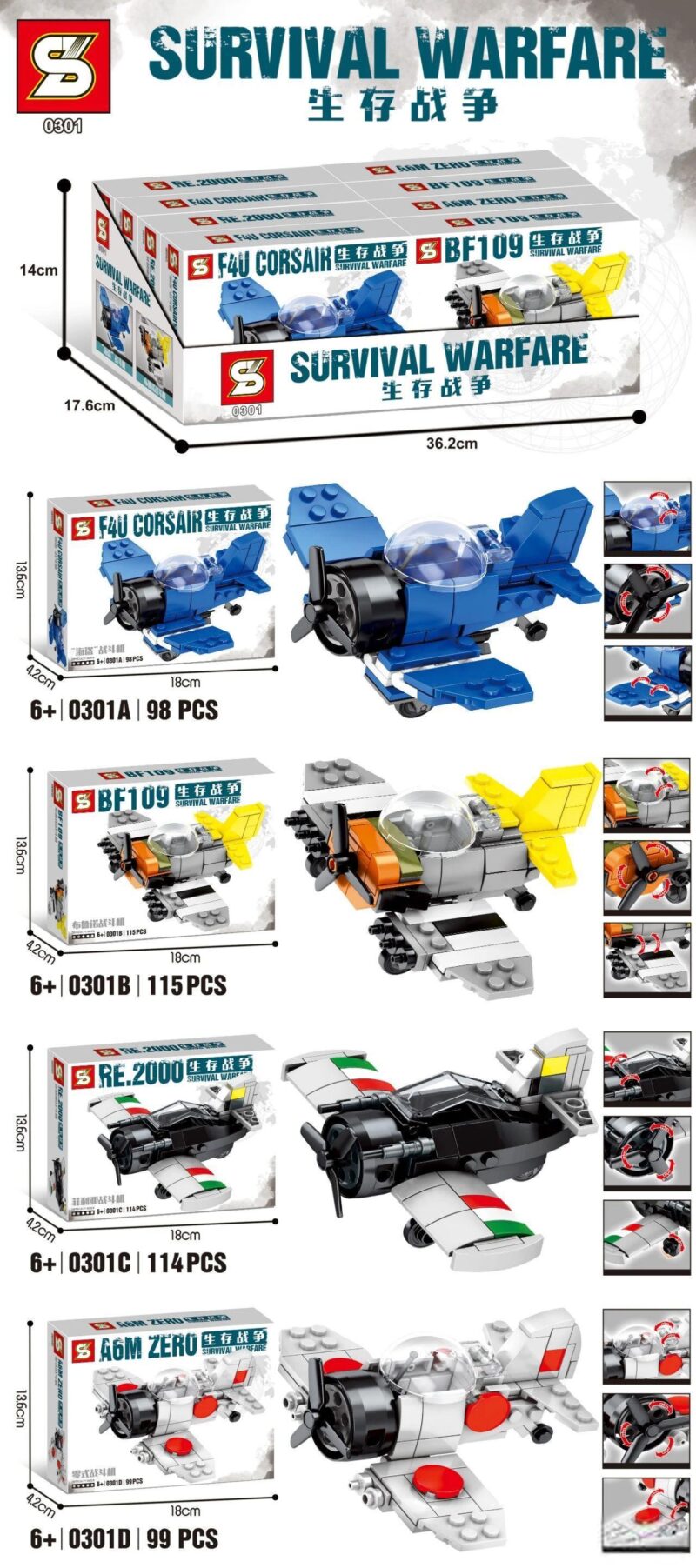 Bộ JIAZHI máy bay chiến đấu 0301 này cho phép bé lắp ráp được 4 mẫu máy bay chiến đấu Q-bản khác nhau: F4U Corsair, BF109, RE.2000 và A6M Zero. Mỗi mẫu đều có thiết kế và màu sắc riêng biệt, mang đến trải nghiệm lắp ráp và chơi đa dạng.
