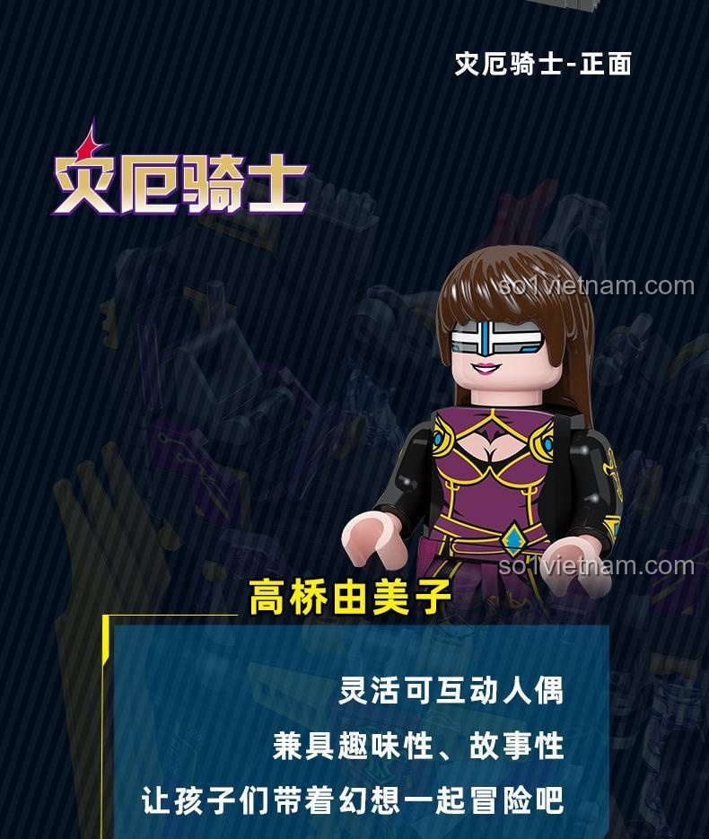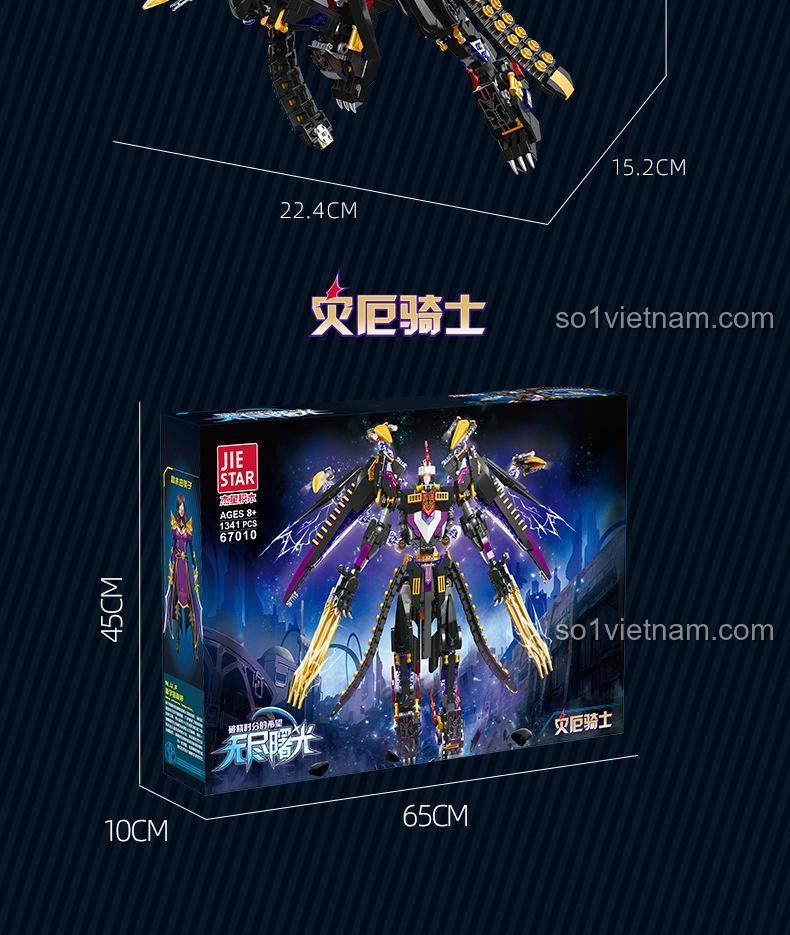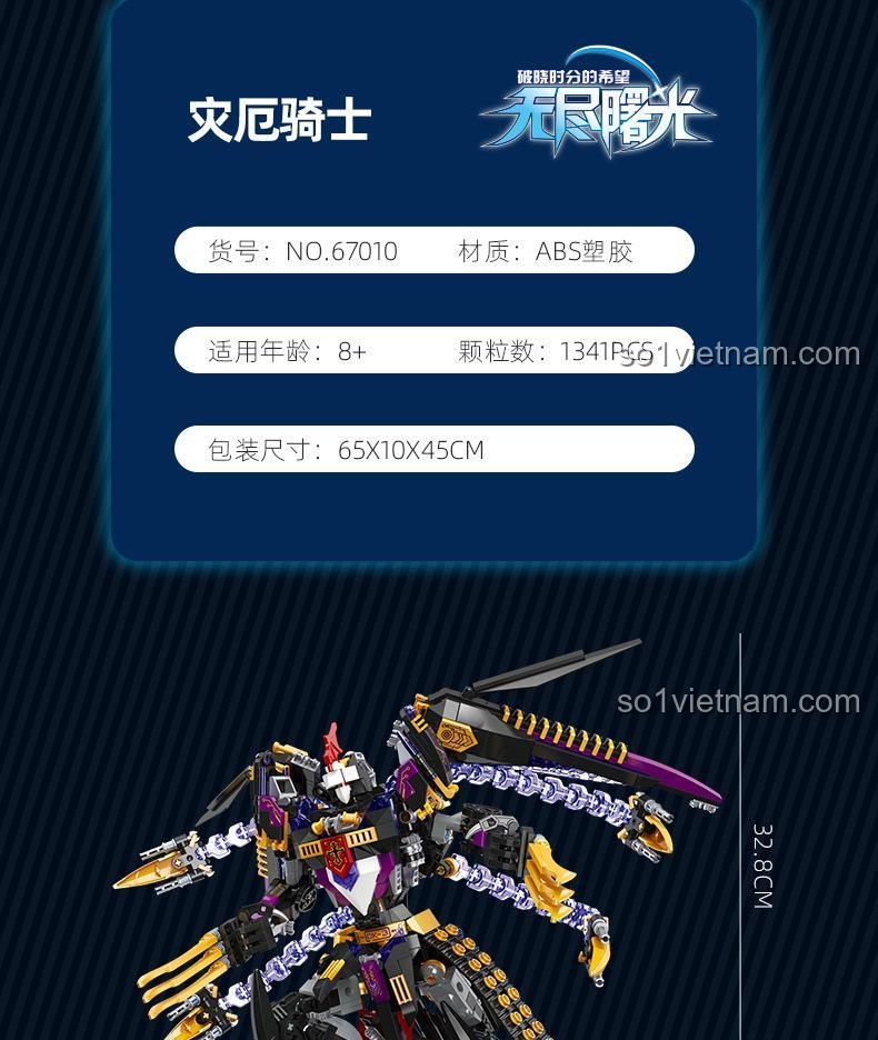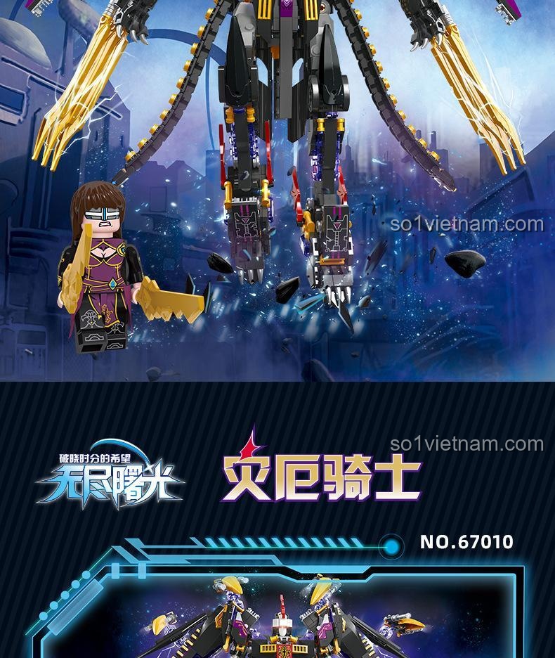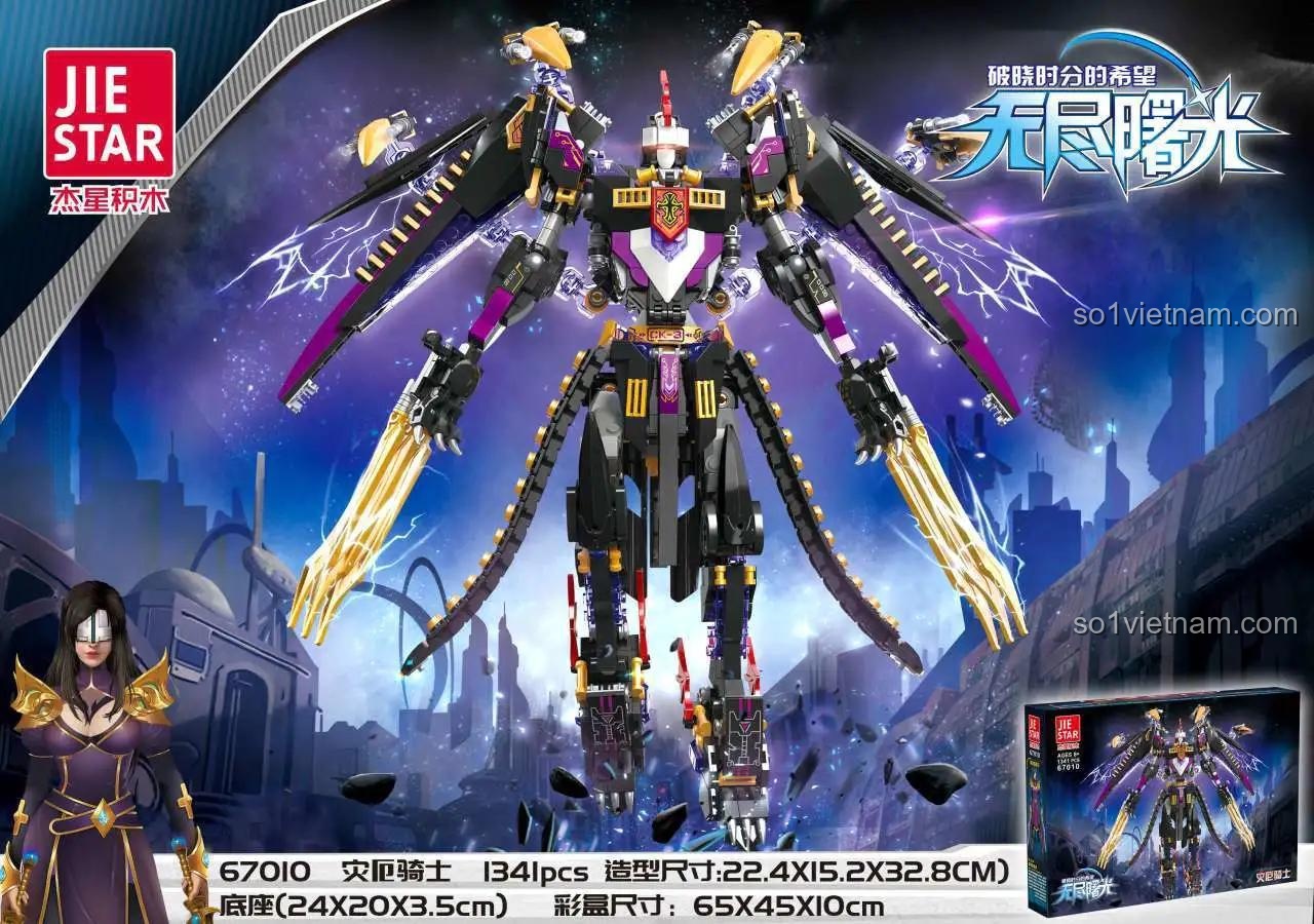 **Đồ chơi mô hình JIESTAR 67010** Vô Tận Bình Minh: Kỵ Sĩ Tai Ương gây ấn tượng mạnh mẽ với thiết kế chi tiết và màu sắc chủ đạo đầy uy lực: Đen huyền bí, Tím quyền năng và Vàng rực rỡ. Với chiều cao mô hình lên đến 32.8 cm, đây thực sự là một mô hình mecha khổng lồ, nổi bật trong bất kỳ bộ sưu tập nào. Từng mảnh ghép được gia công tỉ mỉ, tạo nên một Kỵ Sĩ Tai Ương với giáp chiến đấu vững chắc, lưỡi kiếm vàng sắc bén trên cánh tay và cấu trúc cánh độc đáo, sẵn sàng cho mọi trận chiến. Buồng lái được thiết kế tinh xảo, có thể mở ra để đặt minifigure Takahashi Yumiko vào, tăng thêm tính chân thực và khả năng nhập vai cho bé. **Bộ xếp hình 67010** này không chỉ là một mô hình tĩnh mà còn là một tác phẩm nghệ thuật đầy tính động, thể hiện sự tinh tế trong từng đường nét.