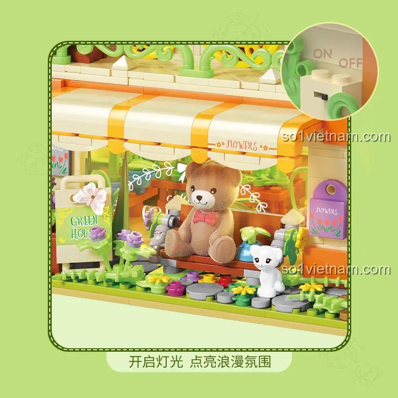Điểm độc đáo và thu hút nhất của Xưởng Hoa Mộng Mơ chính là hệ thống đèn LED tích hợp. Khi bật công tắc, những bóng đèn nhỏ sẽ tỏa sáng lung linh, thắp sáng toàn bộ ngôi nhà, tạo nên một không gian huyền ảo và lãng mạn. Tính năng này không chỉ làm tăng thêm vẻ đẹp thẩm mỹ cho mô hình mà còn mang đến trải nghiệm chơi thú vị, đặc biệt là vào buổi tối, biến ngôi nhà trở thành một điểm nhấn trang trí độc đáo.